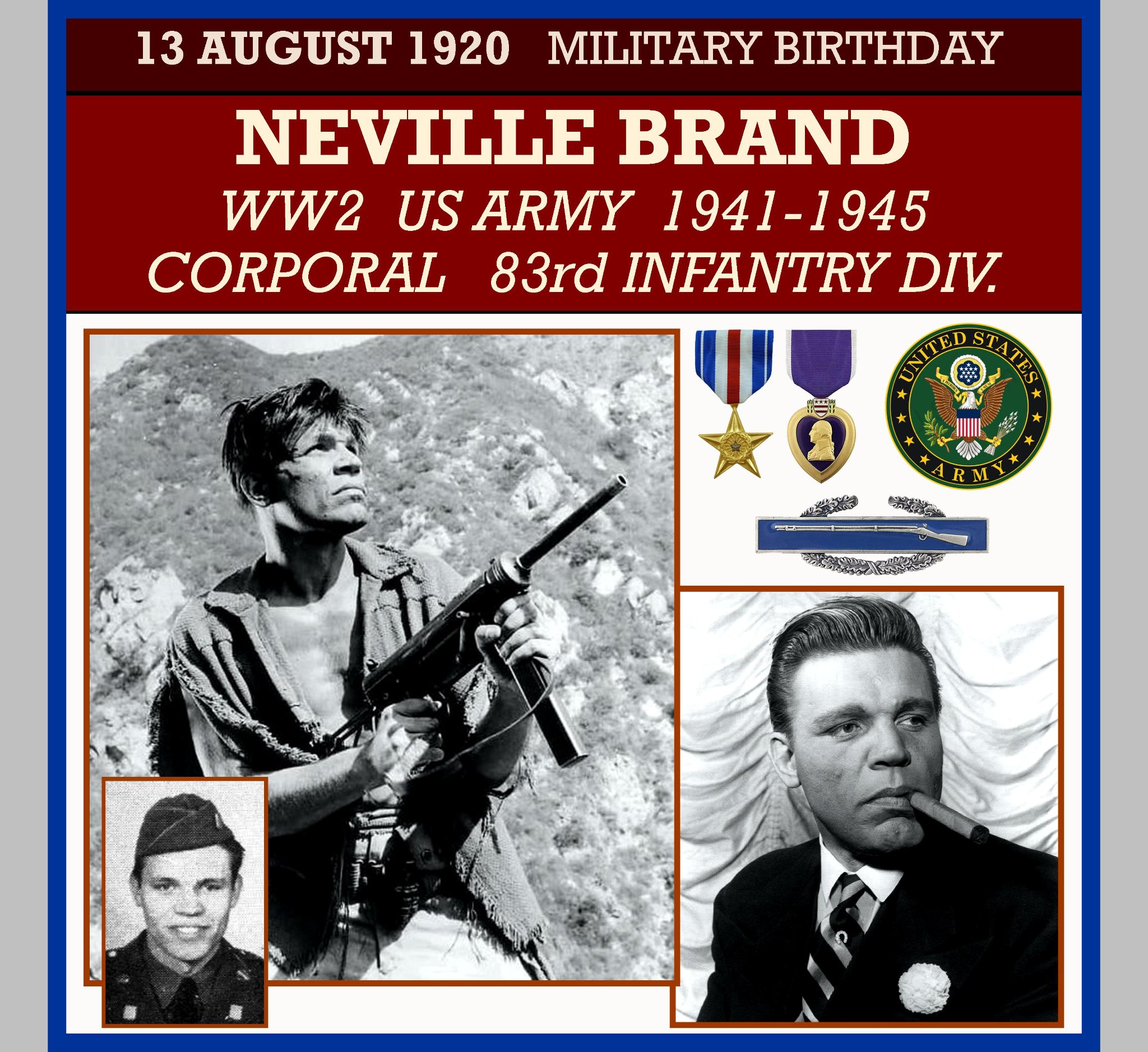 He entered the Illinois Army National Guard on October 23, 1939, as a private in Company F, 129th Infantry Regiment. He was enlisted in the United States Army as Corporal Neville L. Brand, infantryman on March 5, 1941.