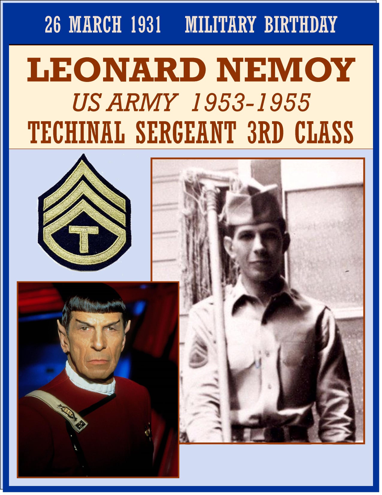 He received his final discharge in November 1955 with the rank of Sergeant. According to the National Archives, Nimoy’s Army personnel file was destroyed in 1973 during a major fire at the National Personnel Records Center in St. Louis, Missouri… and as a result, there’s not much public information about his service.