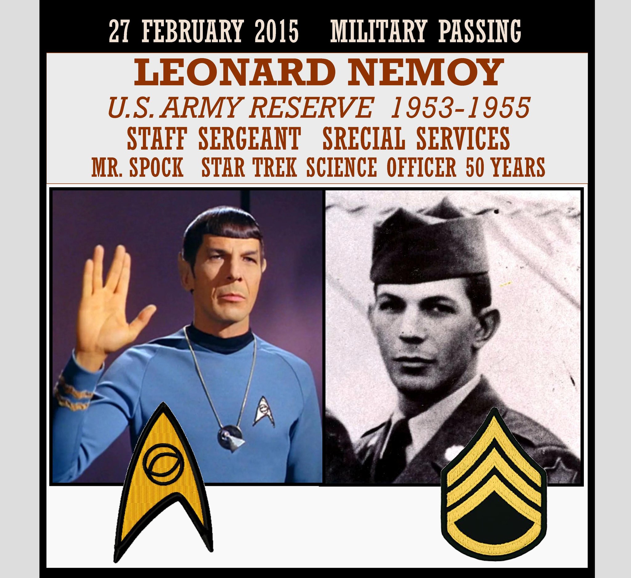 Leonard Simon Nimoy (March 26, 1931 â February 27, 2015) was an American actor, famed for playing Spock in the Star Trek franchise for almost 50 years. This includes originating Spock in the original Star Trek series in 1966, then Star Trek: The Animated Series, the first six Star Trek films, and Star Trek: The Next Generation. Nimoy also directed films, including Star Trek III: The Search for Spock (1984) and Star Trek IV: The Voyage Home (1986), and appeared in several films, television shows, and voice acted in several video games. Outside of acting, Nimoy was a film director, photographer, author, singer, and songwriter.