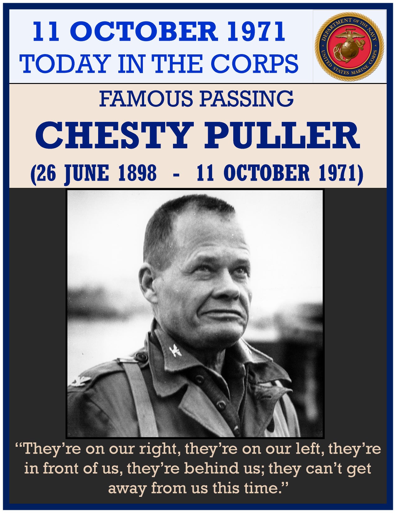 Lewis Burwell “Chesty” Puller (June 26, 1898 â October 11, 1971) served as a United States Marine Corps officer. Beginning his career fighting guerillas in Haiti and Nicaragua as part of the Banana Wars, he later served with distinction in World War II and the Korean War as a senior officer. By the time of his retirement in 1955, he had reached the rank of lieutenant general.