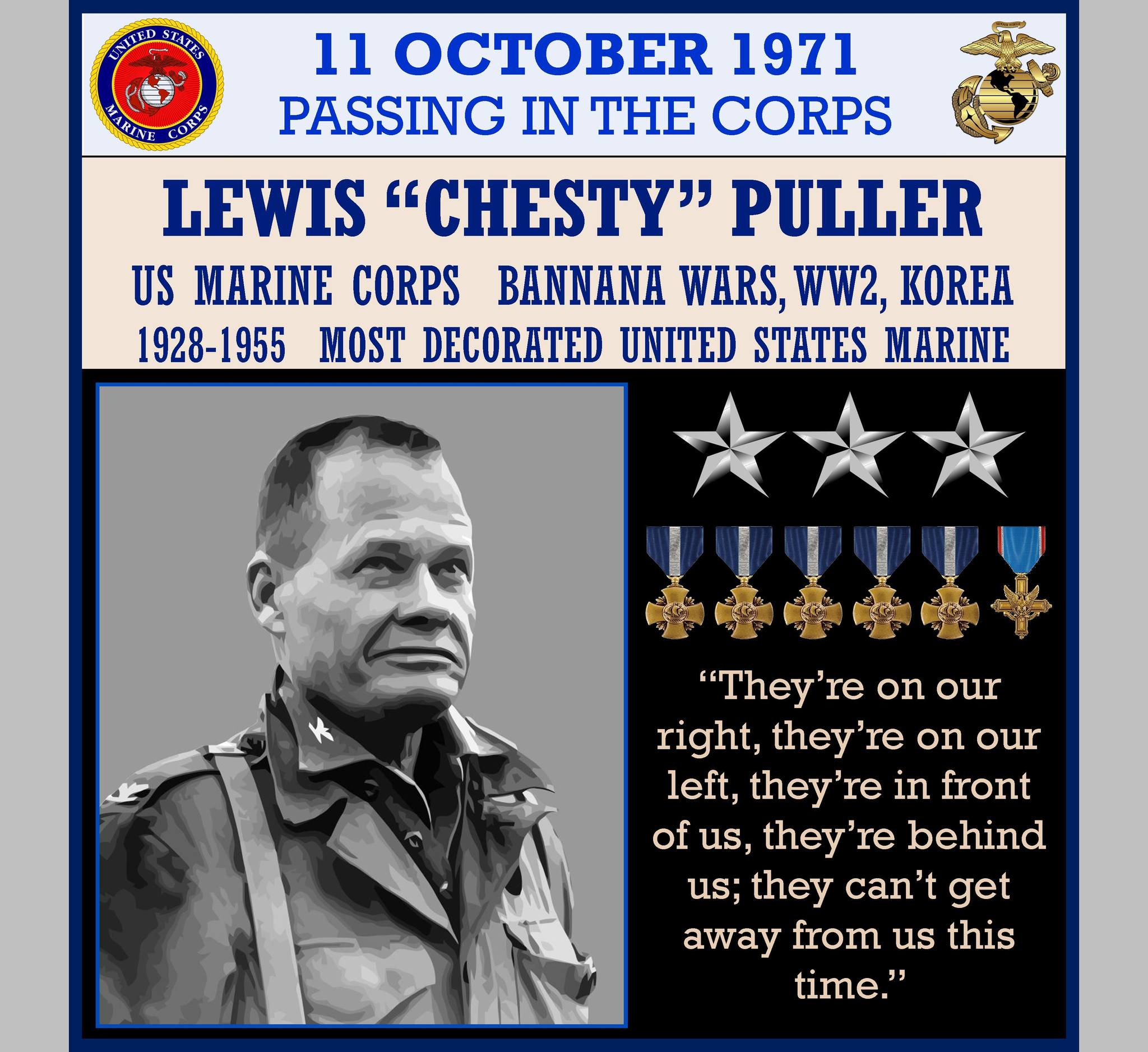 Lewis Burwell “Chesty” Puller (June 26, 1898 â October 11, 1971) served as a United States Marine Corps officer. Beginning his career fighting guerillas in Haiti and Nicaragua as part of the Banana Wars, he later served with distinction in World War II and the Korean War as a senior officer. By the time of his retirement in 1955, he had reached the rank of lieutenant general.