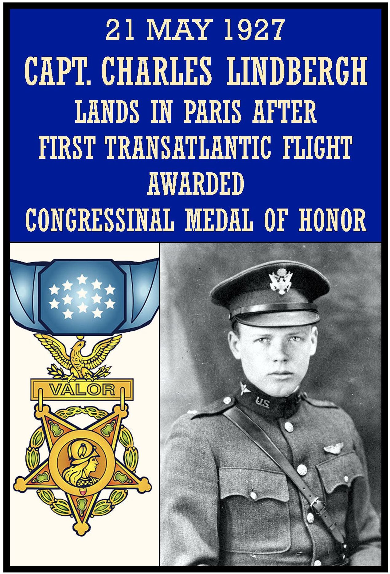Rank and organization: Captain, U.S. Army Air Corps Reserve. Place and date: From New York City to Paris, France, 20-21 May 1927. Entered service at: Little Falls, Minn. Born: 4 February 1902, Detroit, Mich. G.O. No.: 5, W.D., 1928; act of Congress 14 December 1927. Citation: For displaying heroic courage and skill as a navigator, at the risk of his life, by his nonstop flight in his airplane, the Spirit of St. Louis, from New York City to Paris, France, 20-21 May 1927, by which Capt. Lindbergh not only achieved the greatest individual triumph of any American citizen but demonstrated that travel across the ocean by aircraft was possible.