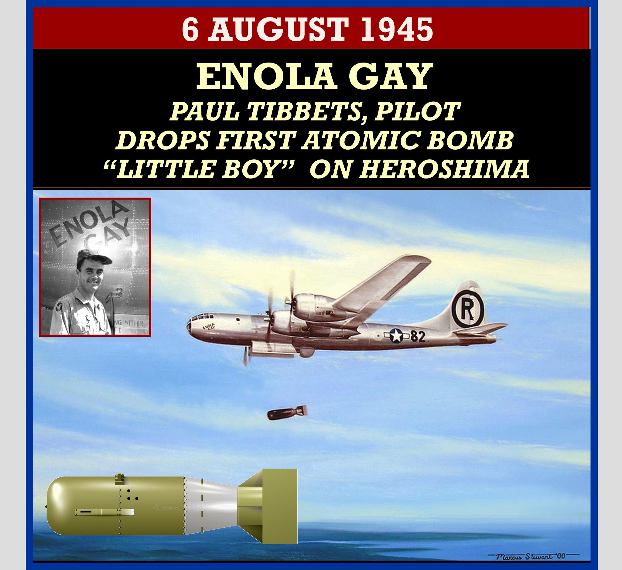 “Little Boy” was the codename for the type of atomic bomb dropped on the Japanese city of Hiroshima on 6 August 1945 during World War II. It was the first nuclear weapon used in warfare. The bomb was dropped by the Boeing B-29 Superfortress Enola Gay piloted by Colonel Paul W. Tibbets, Jr., commander of the 509th Composite Group of the United States Army Air Forces and Captain Robert A. Lewis. It exploded with an energy of approximately 15 kilotons of TNT (63 TJ) and caused widespread death and destruction throughout the city. The Hiroshima bombing was the second man-made nuclear explosion in history, after the Trinity nuclear test.