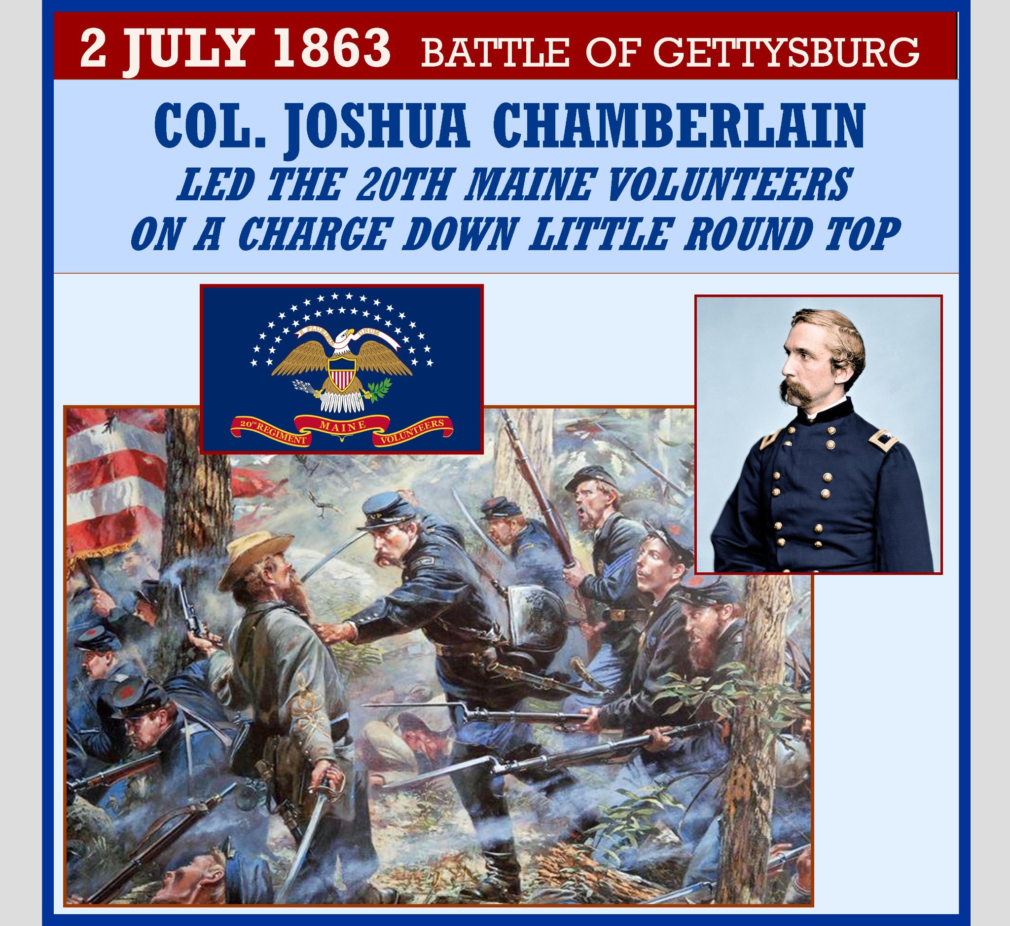 Little Round Top was successfully defended by a brigade under Colonel Strong Vincent, who was mortally wounded during the fighting and died five days later. The 20th Maine Volunteer Infantry Regiment, commanded by Colonel Joshua Lawrence Chamberlain, fought its most famous engagement there, culminating in a dramatic downhill bayonet charge. The battle at Little Round Top subsequently became one of the most well-known actions at Gettysburg, and of the entire war.