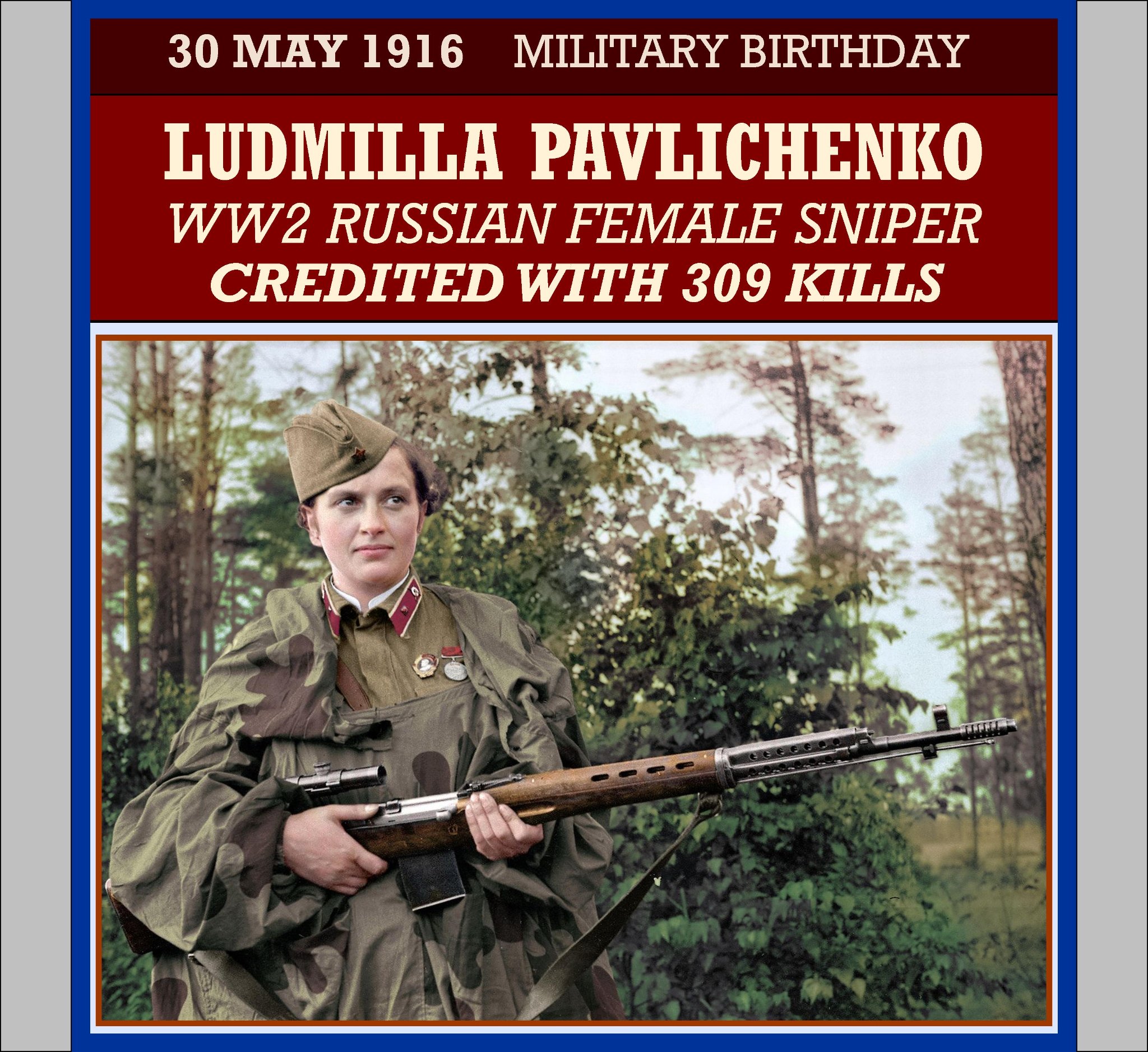 Lyudmila Mikhailovna Pavlichenko, (30 May 1916 – 10 October 1974) was a Soviet sniper in the Red Army during World War II, who was credited with 309 confirmed deaths, making her the most successful female sniper in recorded history.