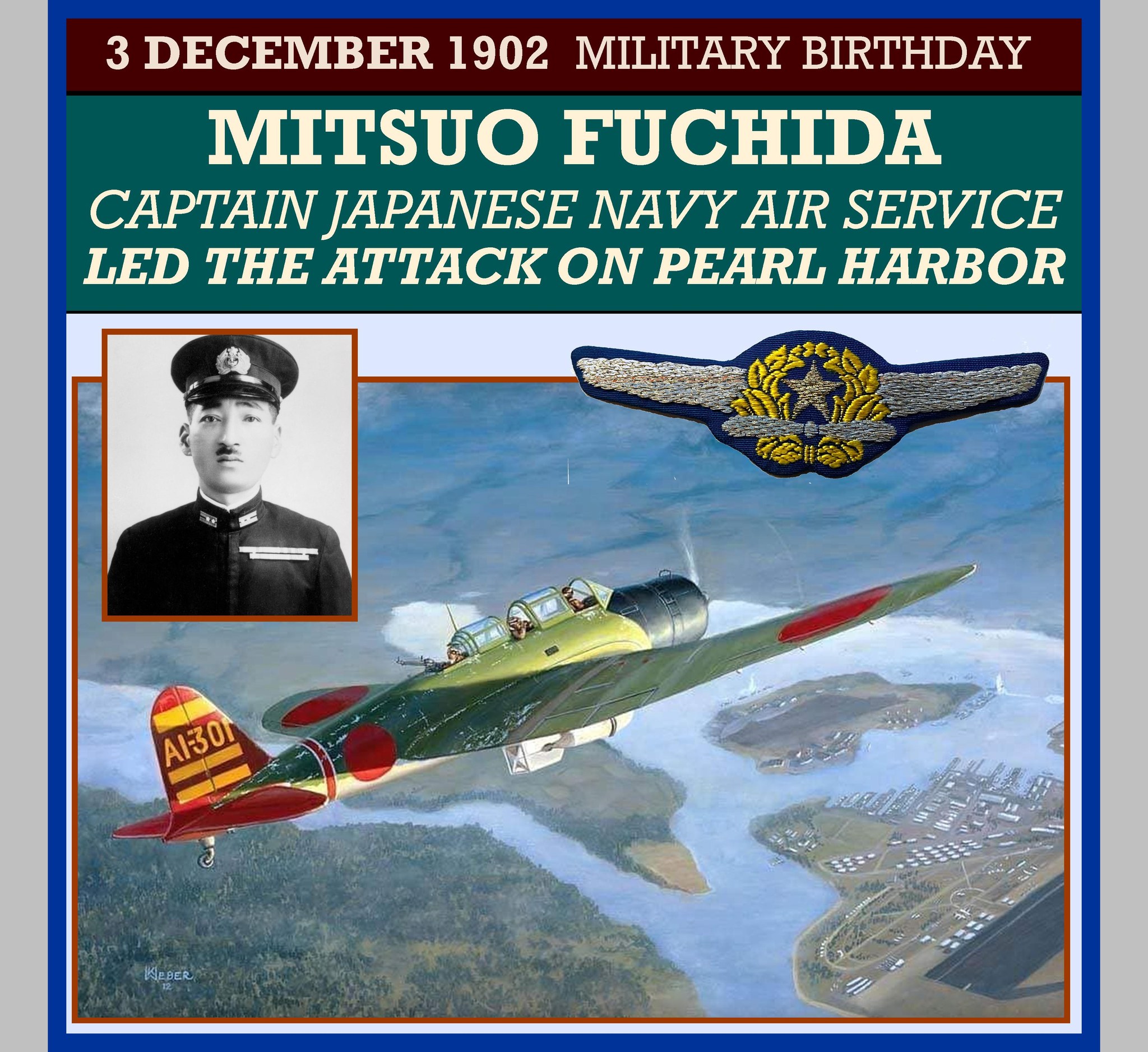 Mitsuo Fuchida (æ·µç° ç¾æ´¥é, 3 December 1902 â 30 May 1976) was a Japanese captain in the Imperial Japanese Navy Air Service and a bomber aviator in the Imperial Japanese Navy before and during World War II. He is perhaps best known for leading the first wave of air attacks on Pearl Harbor on 7 December 1941. Working under the overall fleet commander, Vice Admiral ChÅ«ichi Nagumo, Fuchida was responsible for the coordination of the entire aerial attack.