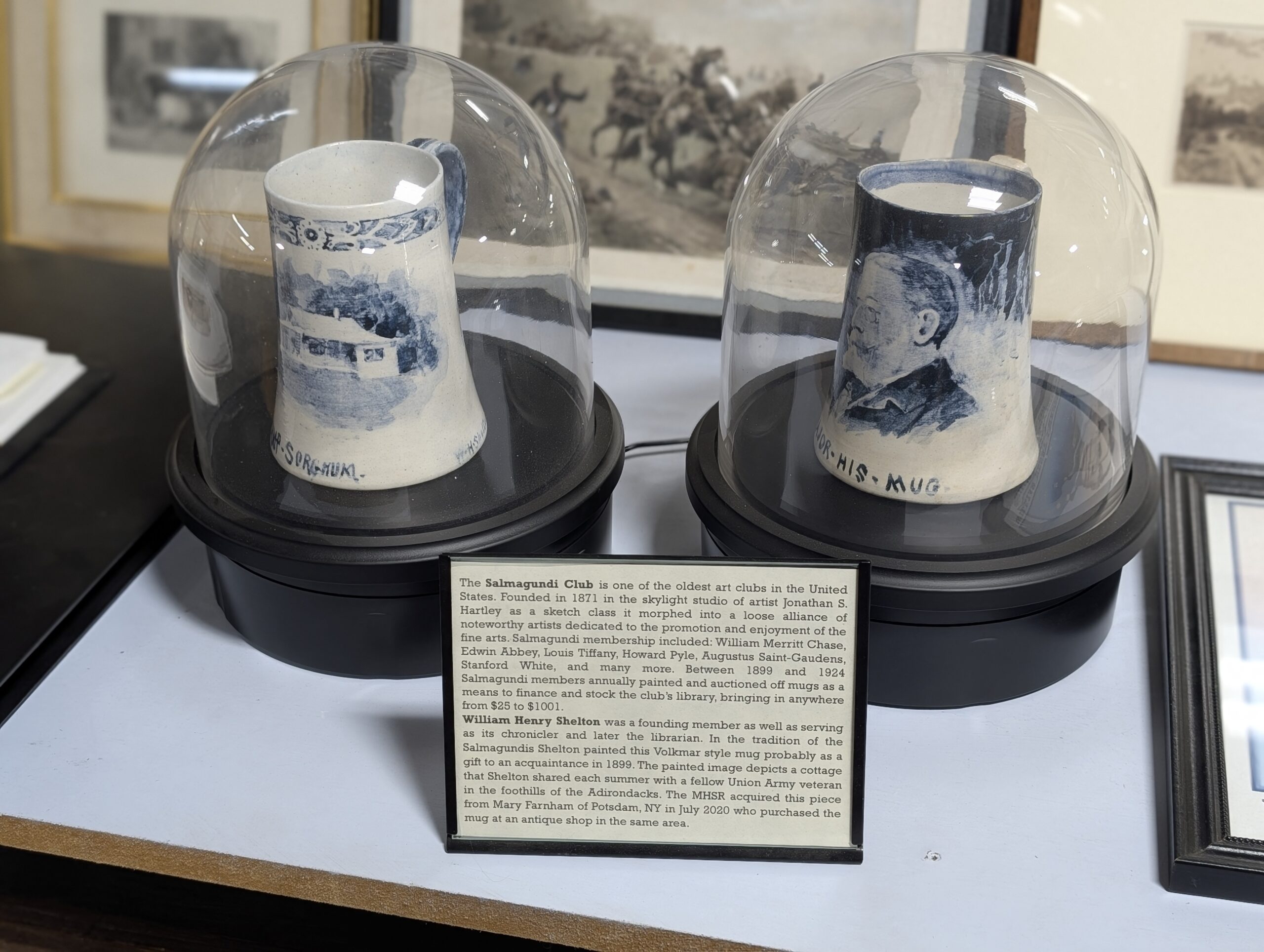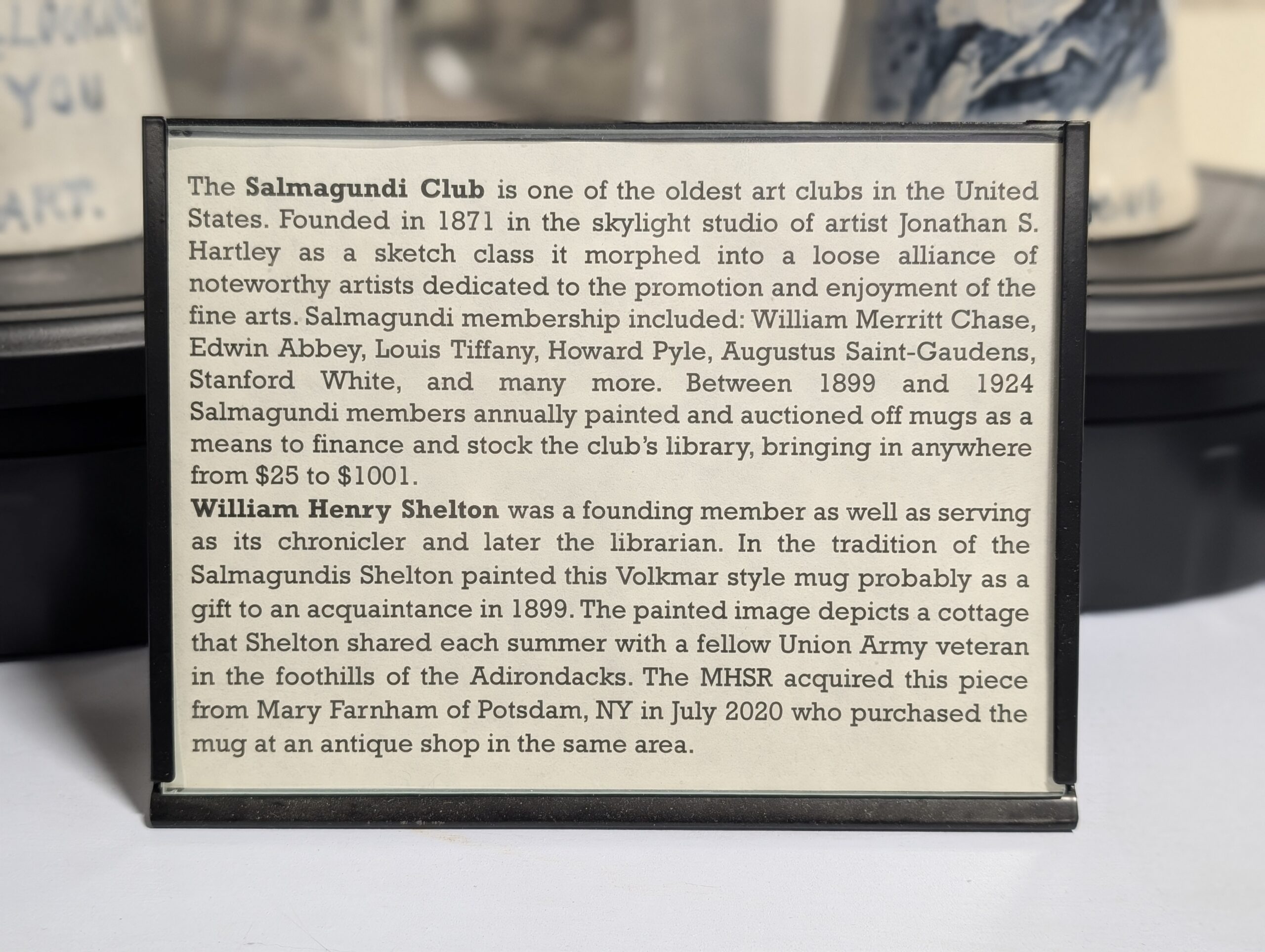 Intriguingly, a plaque details the history of the Salmagundi Club, founded in 1871, and its association with William Henry Shelton. The plaque highlights Shelton, a founding member, and a Volkmar-style mug he painted in 1899. This particular mug was a gift to a Union Army veteran and depicted a shared cottage in the Adirondacks, illustrating the personal bonds forged even after the conflict. This piece was acquired by MHSR in July 2020.