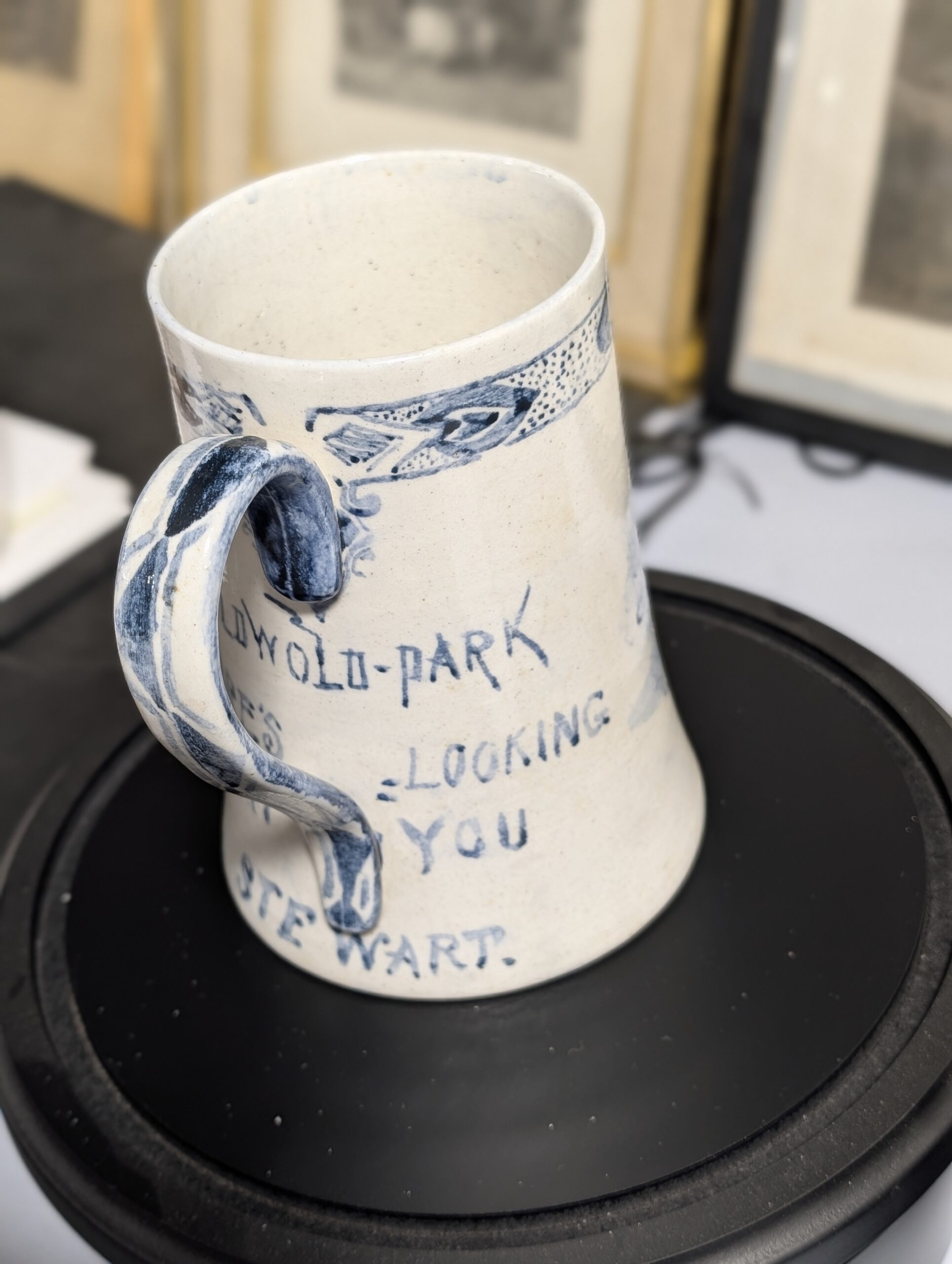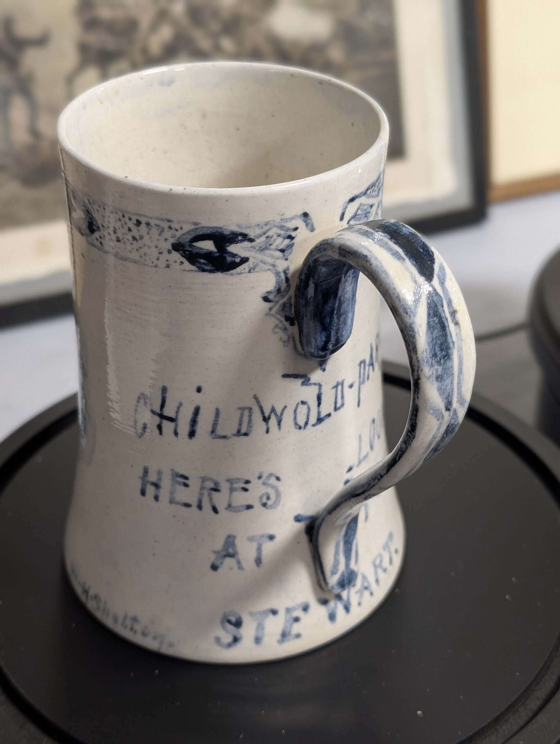 Some mugs present more enigmatic inscriptions, demanding deeper archival research. The mug featuring the lettering ‘Childwolo-par-LOOK HERE’S AT STEWART.’ and another bearing the text ‘OLD-PARK LOOKING YOU STEWART.’, both with blue hand-painted decorations, likely relate to specific military installations, units, or events. These pieces, while their precise context is yet to be fully deciphered, represent the enduring impulse to personalize and commemorate military service.