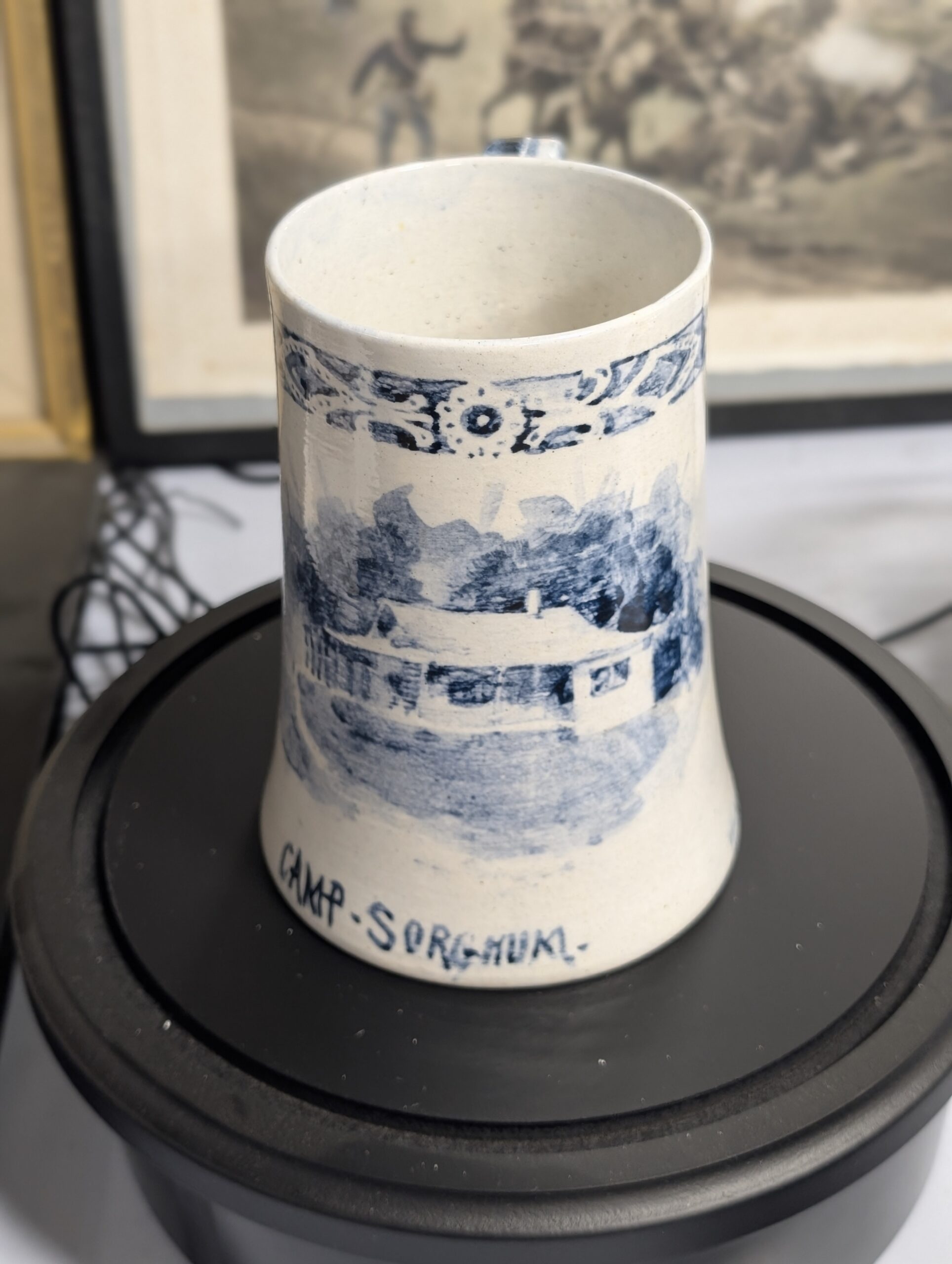 A white ceramic mug with hand-painted blue scenes and the inscription ‘CAMP-SORGHUM-‘ strongly suggests a connection to Camp Sorghum, a Confederate prisoner-of-war camp in Columbia, South Carolina, during the American Civil War. Such an item could have been created by or for prisoners, serving as a grim reminder of their confinement.