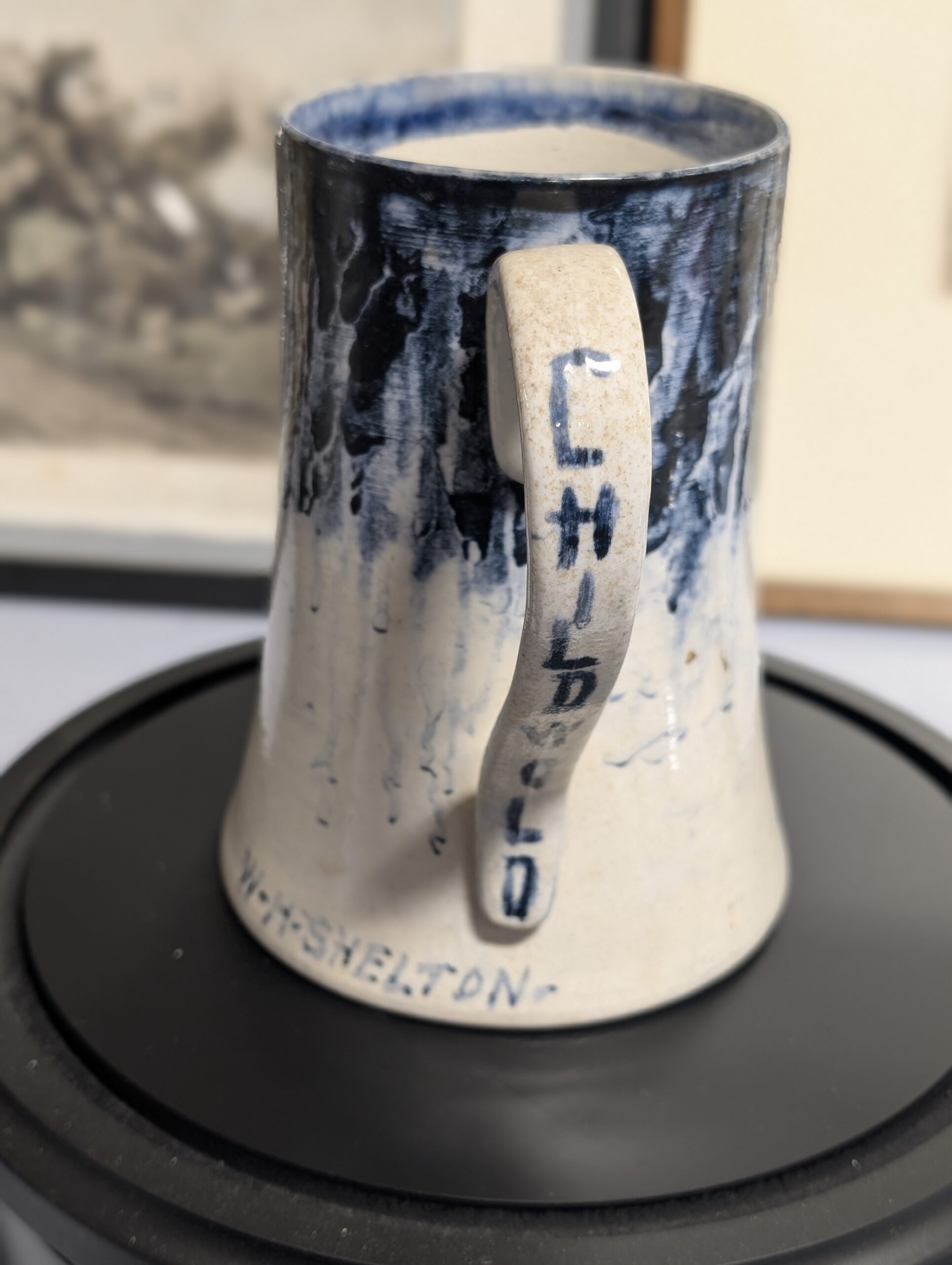 Other examples suggest connections to specific historical events and individuals. A white ceramic mug with dark blue splotches, inscribed with ‘C. H. LLOYD’ on the handle and ‘W.H. SHELTON’ near the base, bears stylistic similarities to items common in the 19th century. Such stoneware pieces were frequently carried by soldiers, serving as personal refreshment vessels or commemorative keepsakes.