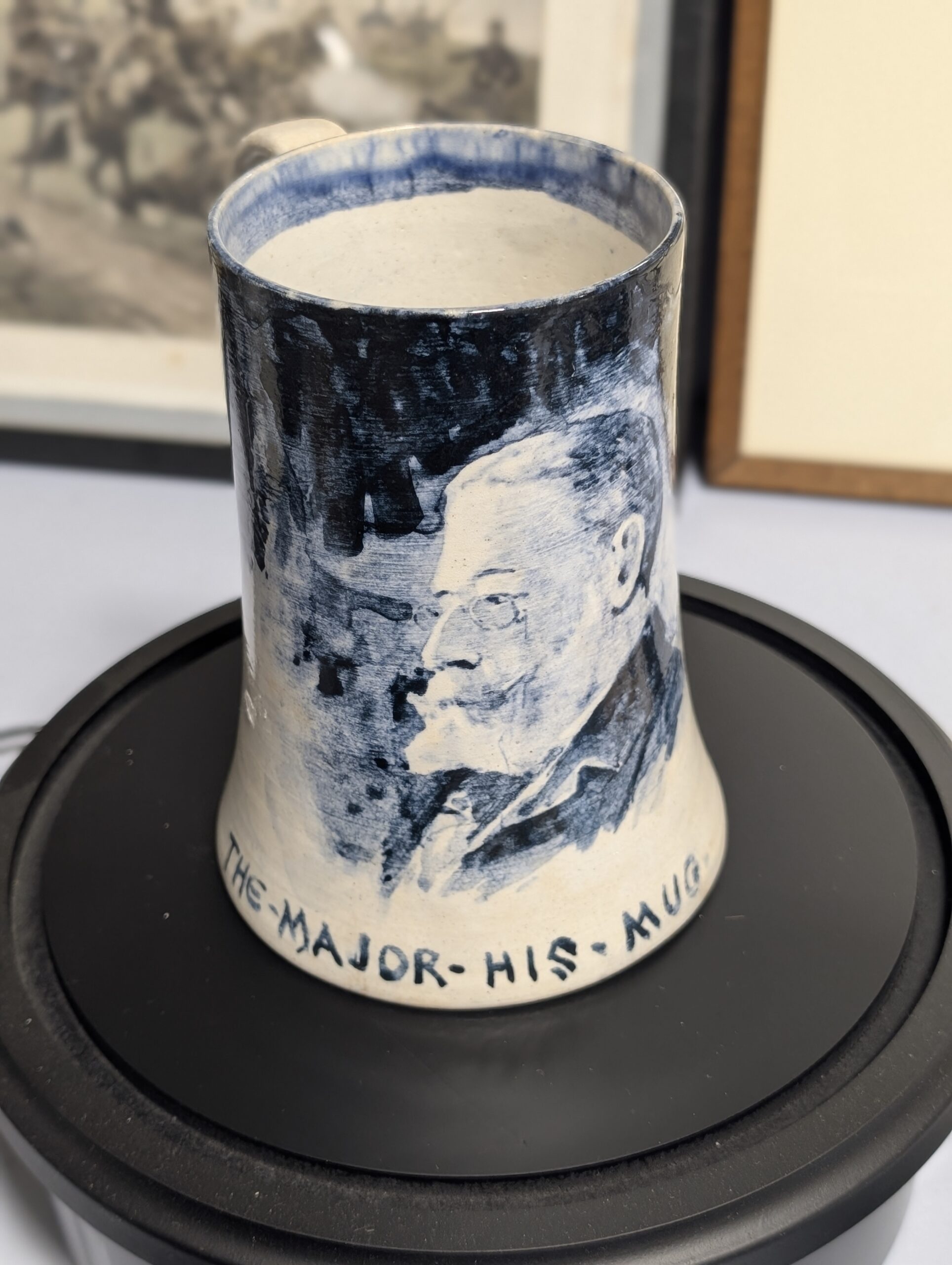 The inscription “THE-MAJOR-HIS-MUG” adorning a hand-painted ceramic piece immediately signifies a personal commission or creation for an officer. While the exact historical period and the identity of “The Major” require further investigation, the personalized nature of the mug speaks to its significance as a treasured possession, likely used daily.