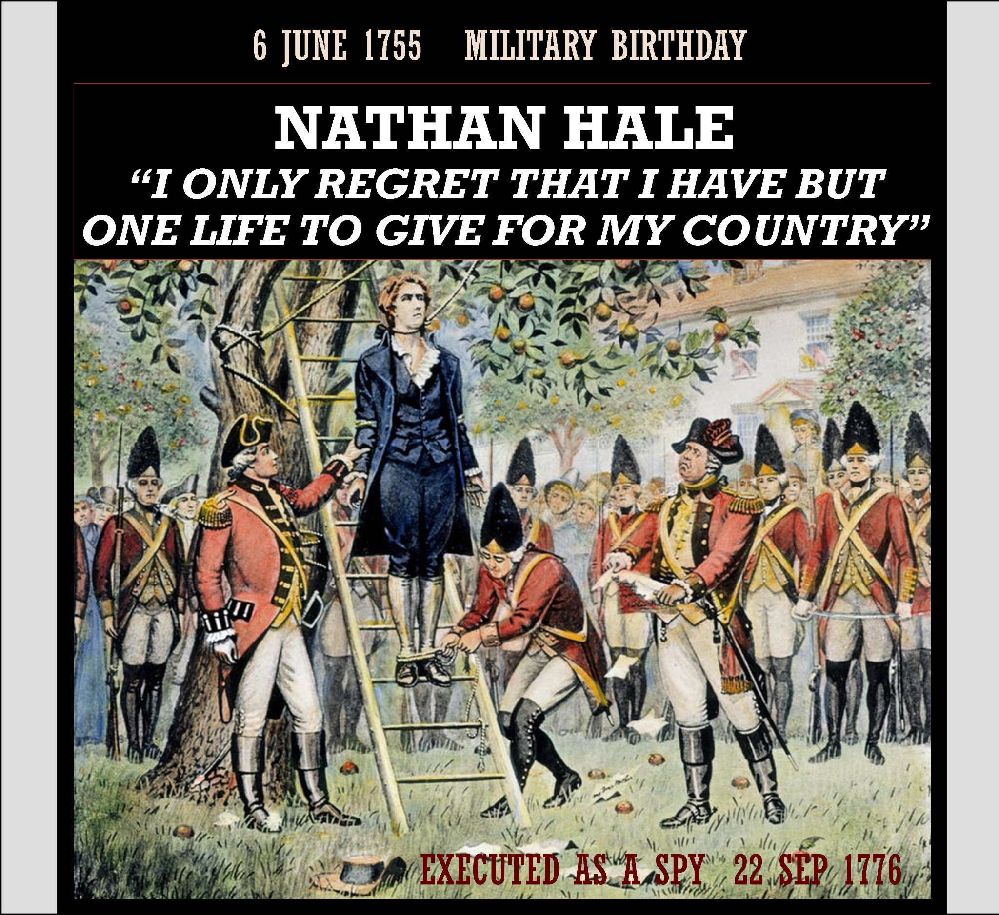 Nathan Hale (June 6, 1755 â September 22, 1776) was an American Patriot, soldier and spy for the Continental Army during the American Revolutionary War. He volunteered for an intelligence-gathering mission in New York City but was captured by the British and executed. Hale is considered an American hero and in 1985 was officially designated the state hero of Connecticut.