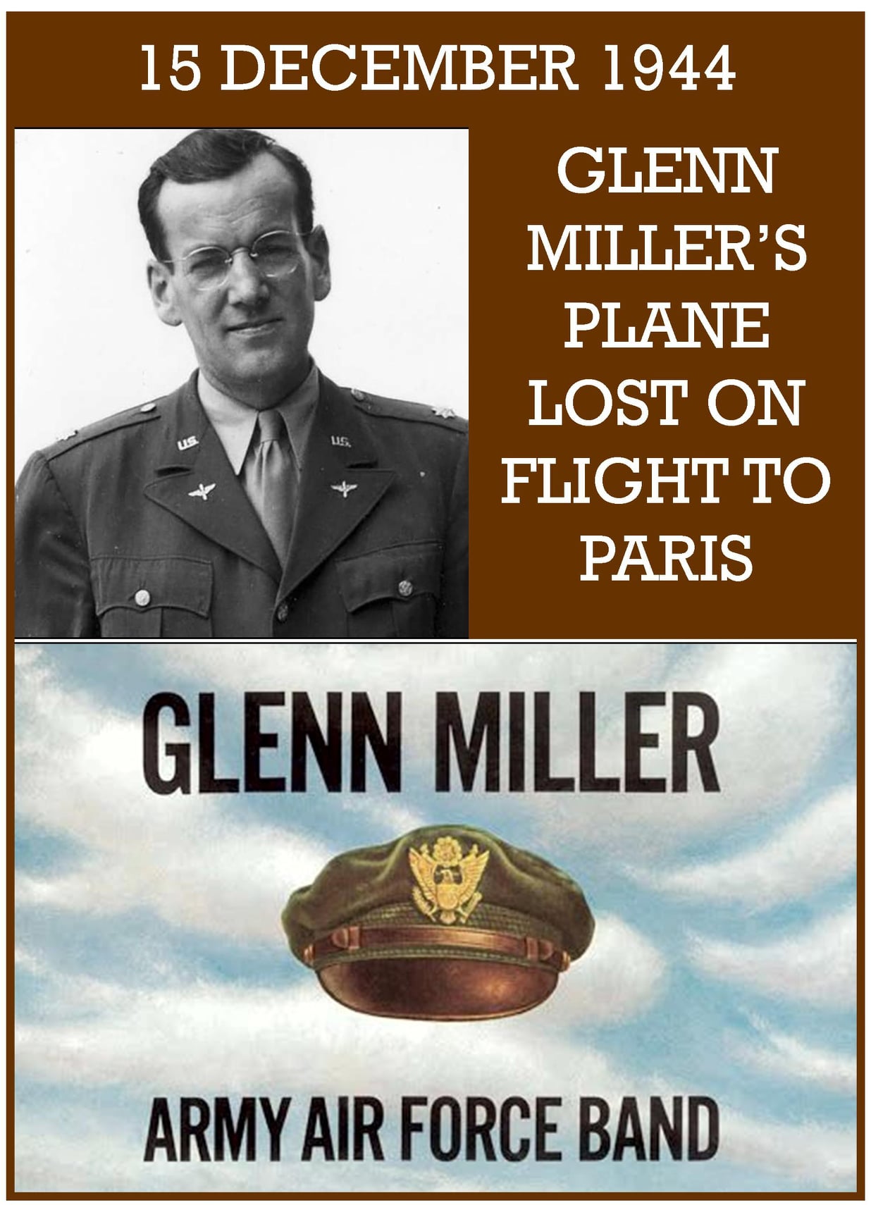 Noted for his big band swing music in the 1930’s and specifically the “Glenn Miller Sound,” American jazz musician Alton Glenn Miller entertained troops with catchy toe-tapping beats and sentimental tunes during WWII. His orchestra was one of the most popular during the big band swing era. Miller was an exceptionally talented musician (he played the trombone), arranger, composer, and bandleader. In 1942, he enlisted in the US Army Air Force leaving behind civilian life but not his music. Appointed as a Captain in the Army Specialist Corps, he devoted himself to raising soldiers’ morale by modernizing the army band. In 1944 on December 15th, Miller was flying in a plane from the UK to get to a performance in Paris, France to play for soldiers who had recently liberated Paris. However, the plane disappeared while flying over the English Channel. Presumably, the plane crashed and both pilots and Miller were killed. Miller was 40 years old; his status is Missing in Action (MIA). rochestermilitary.com