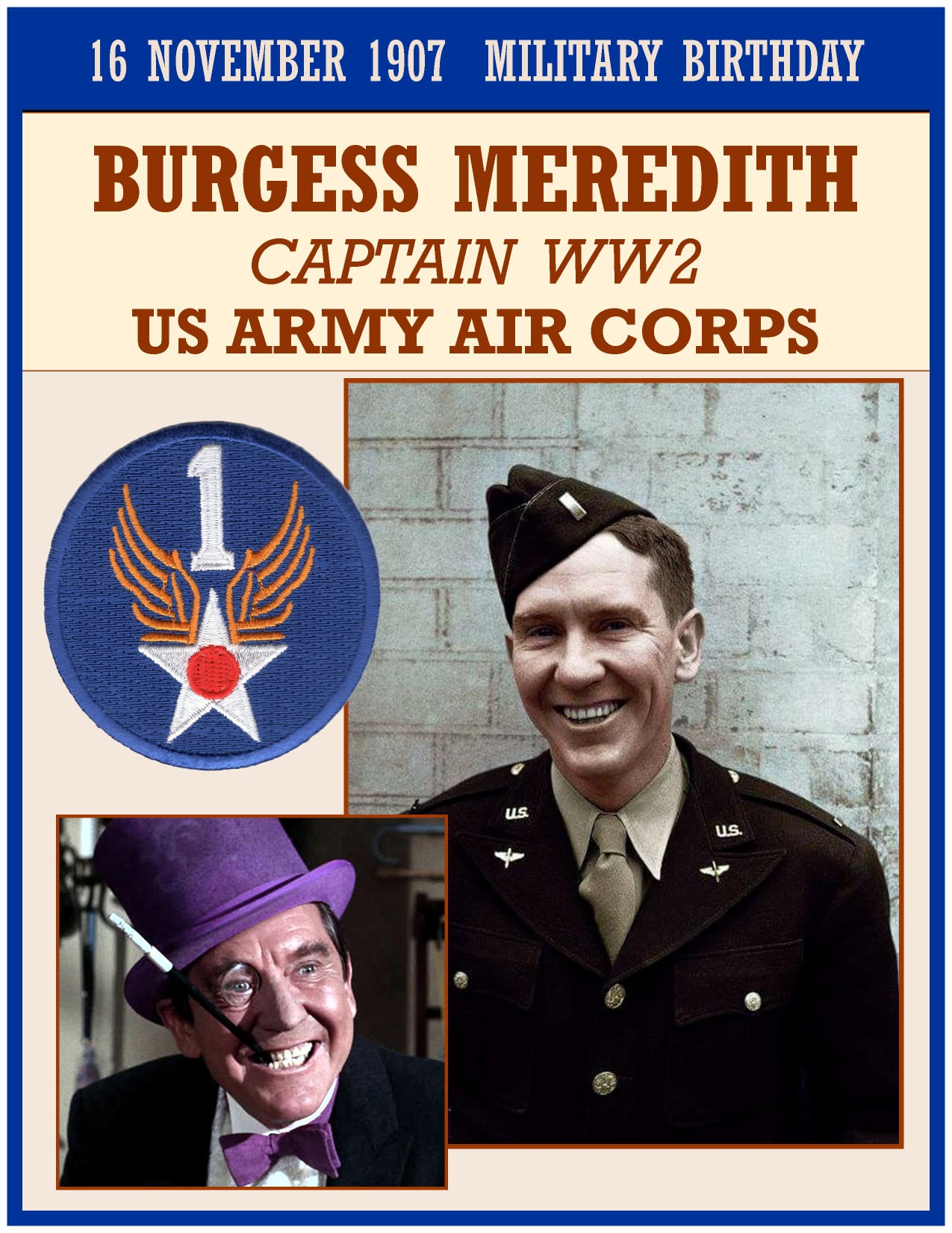 Oliver Burgess Meredith (November 16, 1907 â September 9, 1997) was an American actor, director, producer and writer whose career encompassed theater, film, and television.