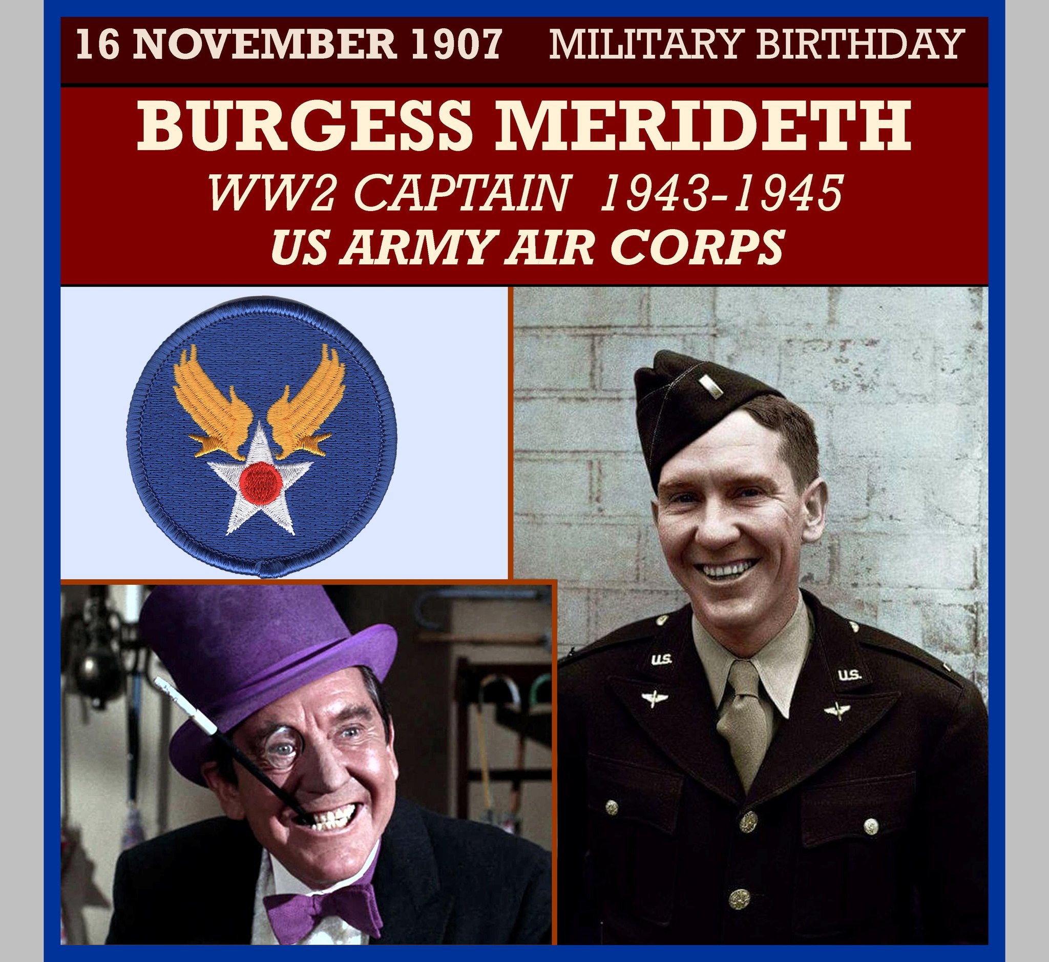 In 1942, Meredith enlisted in the United States Army Air Forces during World War II, reaching the rank of captain. After transferring to the Office of War Information, he made training and education films for America’s armed forces. In 1943 he performed in the USAAF’s recruiting short The Rear Gunner and the U.S. Army training film A Welcome to Britain for troops heading to the UK in preparation for the liberation of Europe. He was released from duty in 1944 to work on the movie The Story of G.I. Joe, in which he played the war correspondent Ernie Pyle. He was discharged from the USAAF in 1945.