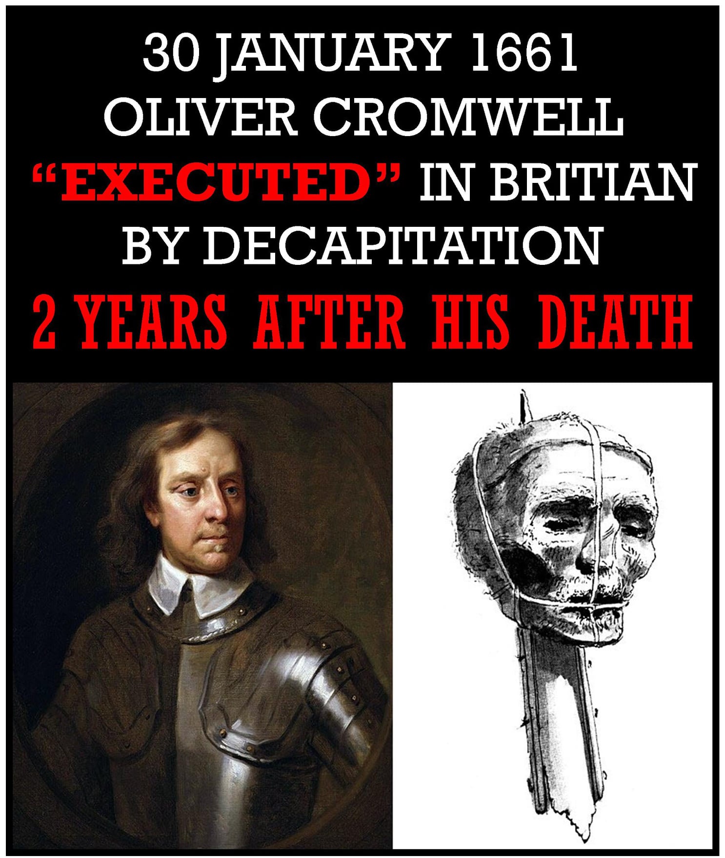Oliver Cromwell died of natural causes on 3 September 1658 at age 59, possibly of infection related to kidney or bladder stones. He was buried with honors, and his son succeeded him as Lord Protector, ironically resembling a new monarchy! Change had again come to Britain, and Cromwellâs son was deposed within a year, and Charles II (son of the executed Charles I) became king in the restored monarchy. In January of 1661 Cromwellâs body was dug up, hung in chains and then beheaded, officially executing him for treason! His head was displayed on a spike in the manner of the day and his body disposed of in a pit. The âexecutionâ took place exactly 12 years after the execution of Charles I.