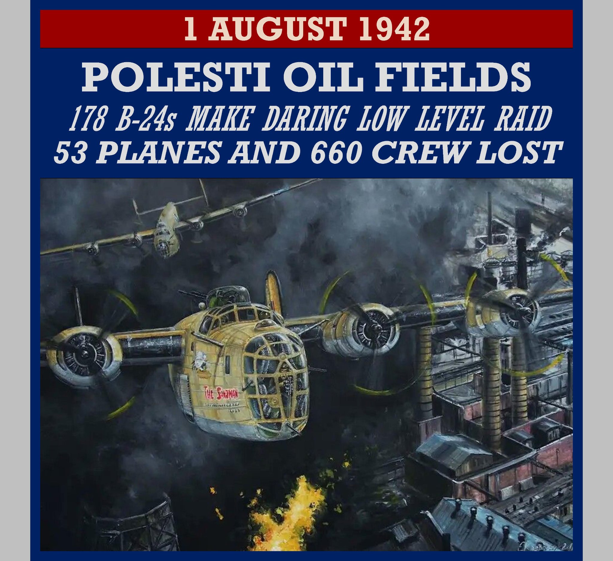 On 1 August 1943, 178 B-24 Liberator bombers flew over 1200 miles from a base in North Africa to Ploesti and staged a daring, low level attack that devestated the targets. The raid was not part of any campaign, but stood alone as a singular blow to an important component of German war-making capability. Losses were heavy and the refineries were rebuilt, but the Ploesti raid stands as a magnificent example of a bold plan, well-executed by brave crews and their extraordinary aircraft.