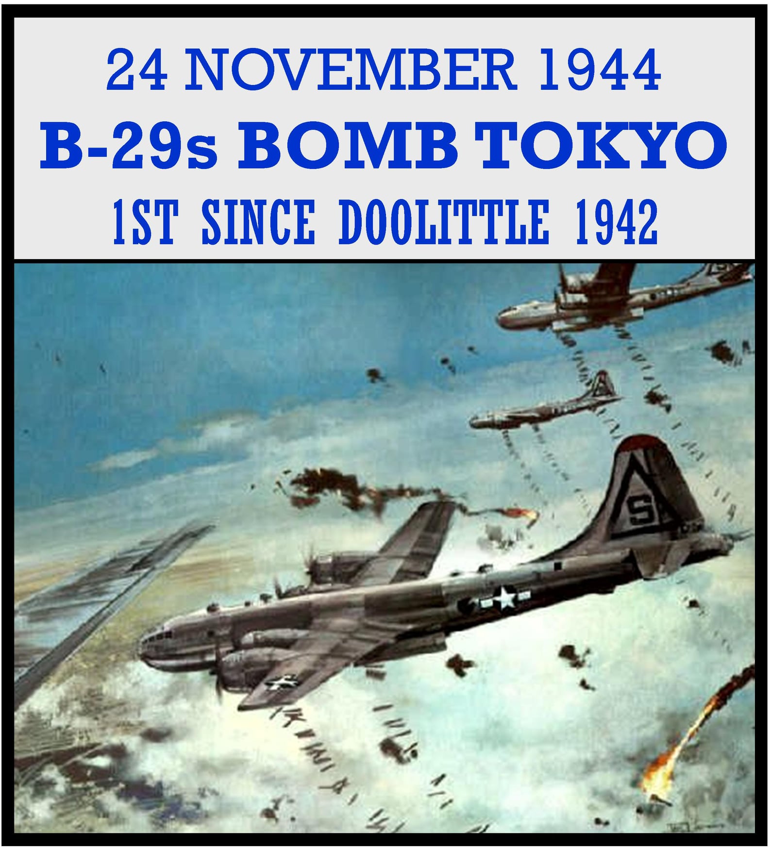 On 24 November 1944, the US air corps launched a massive bombing raid on the Japanese Capital, Tokyo. It was to be the first raid since the 1942 raid of Jimmy Doolittle. The raid involved 111 giant U.S. B-29 Superfortress bombers. The target of the raid was a huge industrial complex that manufactured engines for fighter planes. The many massive raids that followed were designed to destroy the Japanese War Machine.