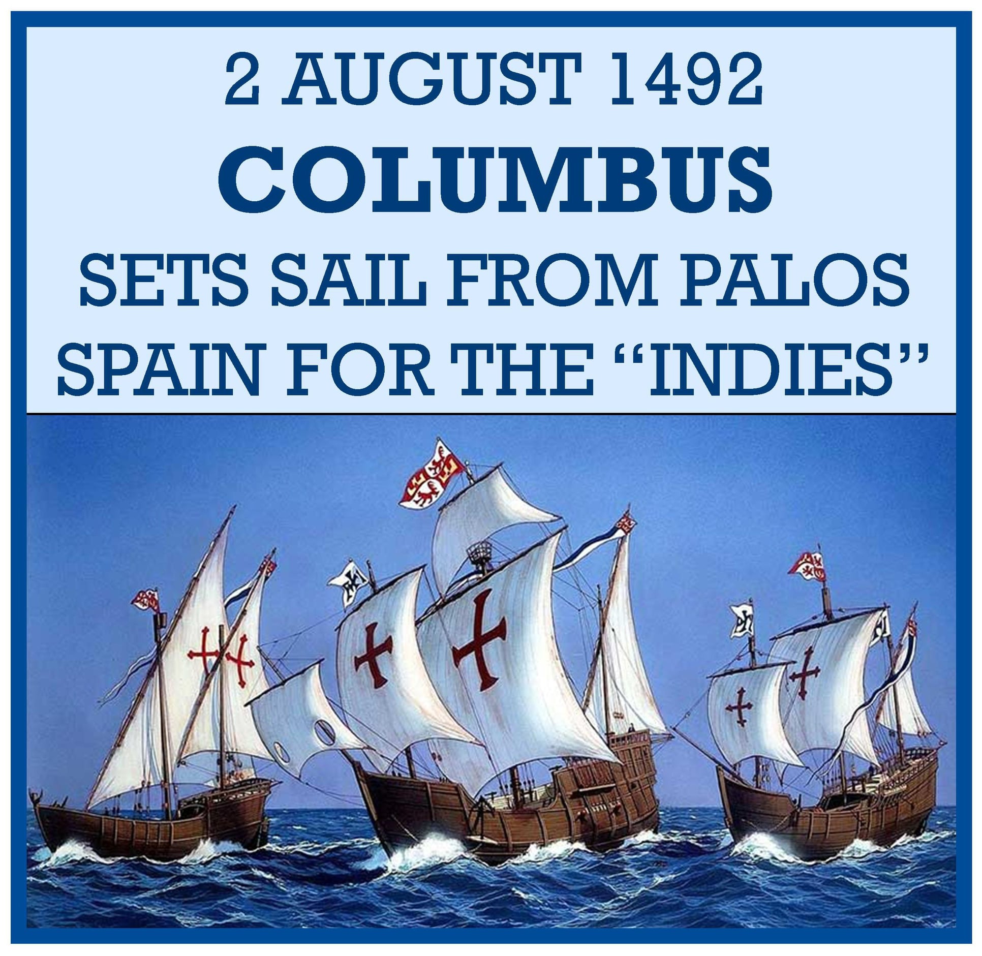 On August 3, 1492, Italian explorer Christopher Columbus started his voyage across the Atlantic Ocean. With a crew of 90 men and three shipsâthe Niña, Pinta, and Santa Mariaâhe left from Palos de la Frontera, Spain. Columbus reasoned that since the world is round, he could sail west to reach âthe eastâ (the lucrative lands of India and China). That reasoning was actually sound, but the Earth is much larger than Columbus thoughtâlarge enough for him to run into two enormous continents (the âNew Worldâ of the Americas) mostly unknown to Europeans.