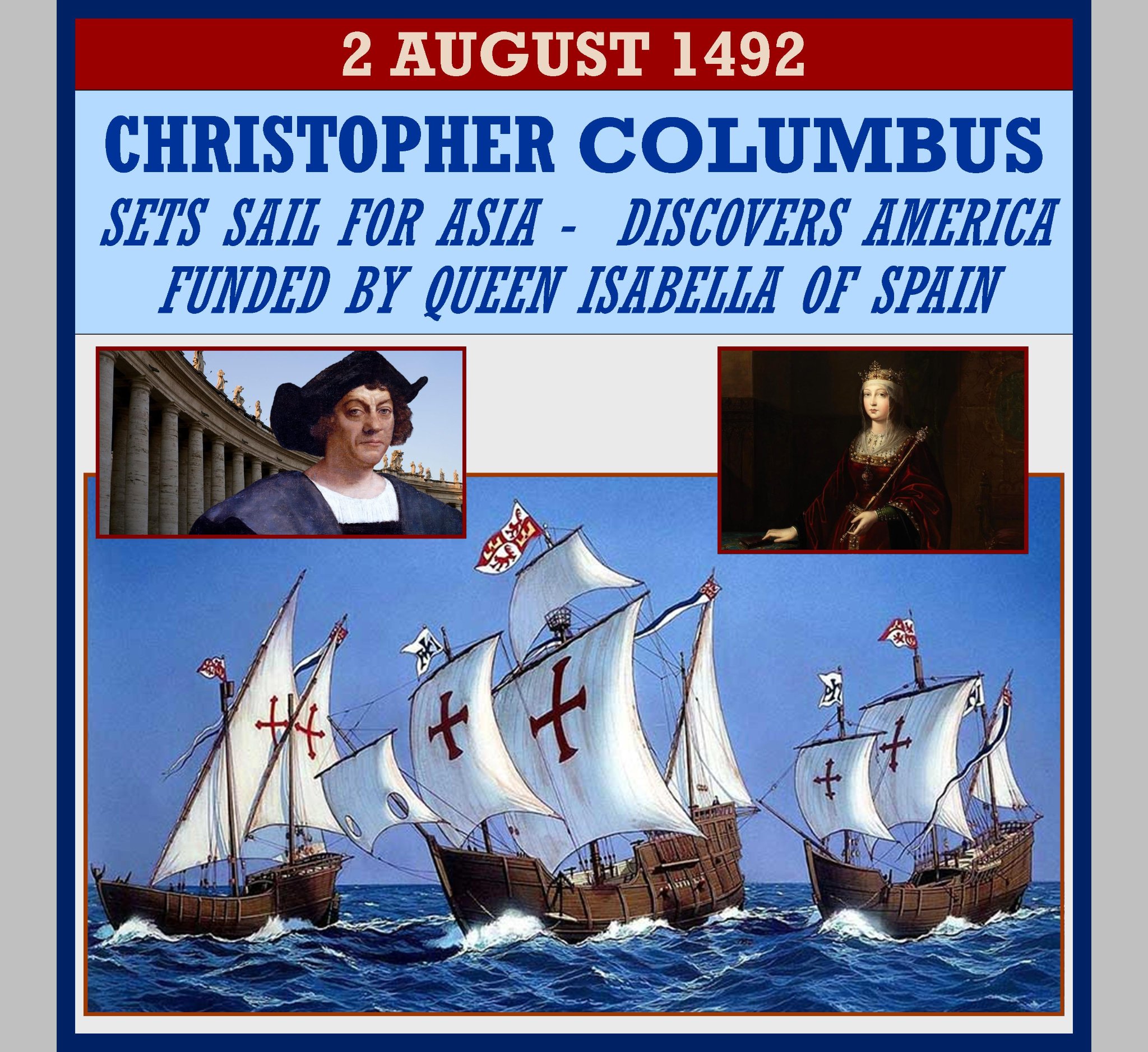 On August 3, 1492, Italian explorer Christopher Columbus started his voyage across the Atlantic Ocean. With a crew of 90 men and three shipsâthe Niña, Pinta, and Santa Mariaâhe left from Palos de la Frontera, Spain. Columbus reasoned that since the world is round, he could sail west to reach âthe eastâ (the lucrative lands of India and China). That reasoning was actually sound, but the Earth is much larger than Columbus thoughtâlarge enough for him to run into two enormous continents (the âNew Worldâ of the Americas) mostly unknown to Europeans.