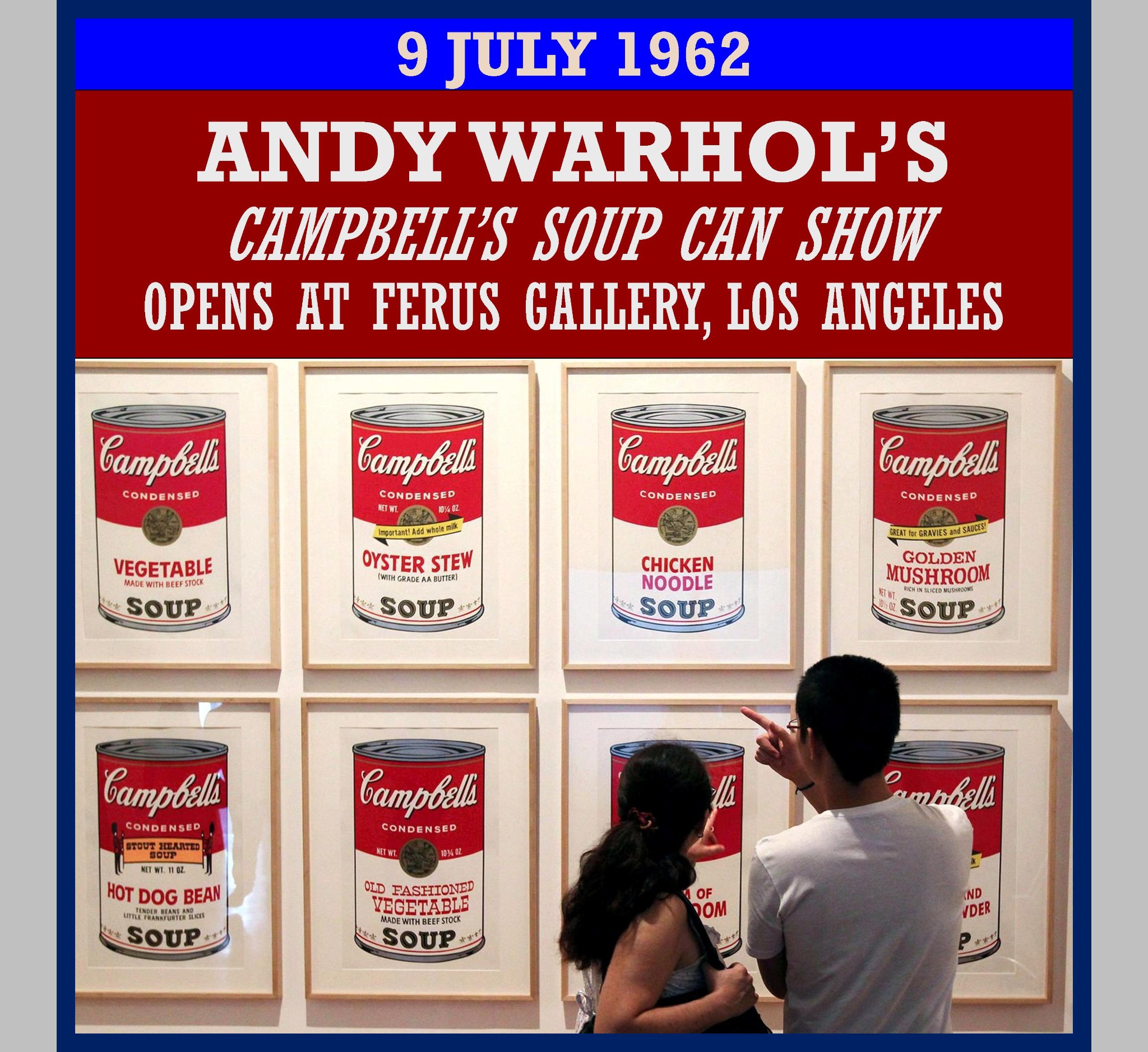 On July 9, 1962, a little-known artist named Andy Warhol opened a small show at the Ferus Gallery in Los Angeles. His head-scratching subject: Campbellâs Soup. Each of his 32 paintings portrayed a different flavor in the lineup, from Tomato to Pepper Pot and Cream of Celery.