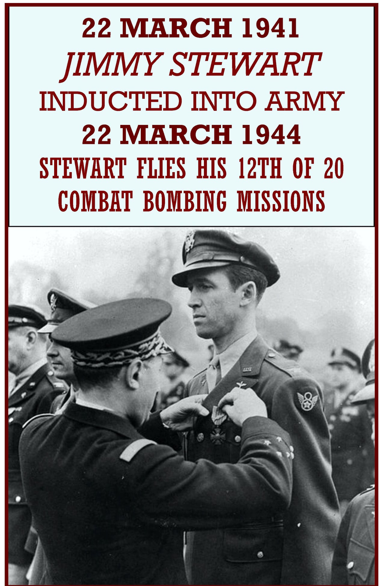 On March 22, 1941, Jimmy Stewart was drafted into the U.S. Armed Forces, the first major Hollywod to be inducted. He was assigned to the Army Air Corps as an enlisted man and stationed at Moffett Field, Calif. During his nine months of training at that base, he also took extension courses with the idea of obtaining a commission. He completed the courses and was awaiting the results when Pearl Harbor took place. A month later he received his commission, and because he had logged over 400 hours as a civilian, he was permitted to take basic flight training at Moffett and received his pilot wings. During the next nine months, he instructed in AT-6, AT-9 and B-17 aircraft and flew bombardiers in the training school at Albuquerque, N.M. In the fall of 1943, Stewart went to England as Commanding Officer of the 703d Bomb Squadron, equipped with B-24s. He began flying combat missions and on March 31, 1944, was appointed Operations Officer of the 453rd Bomb Group and, subsequently, Chief of Staff of the 2nd Combat wing, 2nd Air Division of the 8th Air Force. Stewart ended the war with 20 combat missions. He remained in the USAF Reserve and was promoted to brigadier general on July 23, 1959. He retired on May 31, 1968.