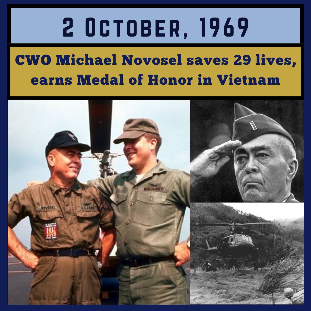 On October 2, 1969, Chief Warrant Officer Michael Novosel, a Vietnam War Dustoff pilot, made repeated trips without air cover or fire support to save 29 wounded soldiers under constant enemy fire in Kien Tuong Province, earning him the Medal of Honor.
