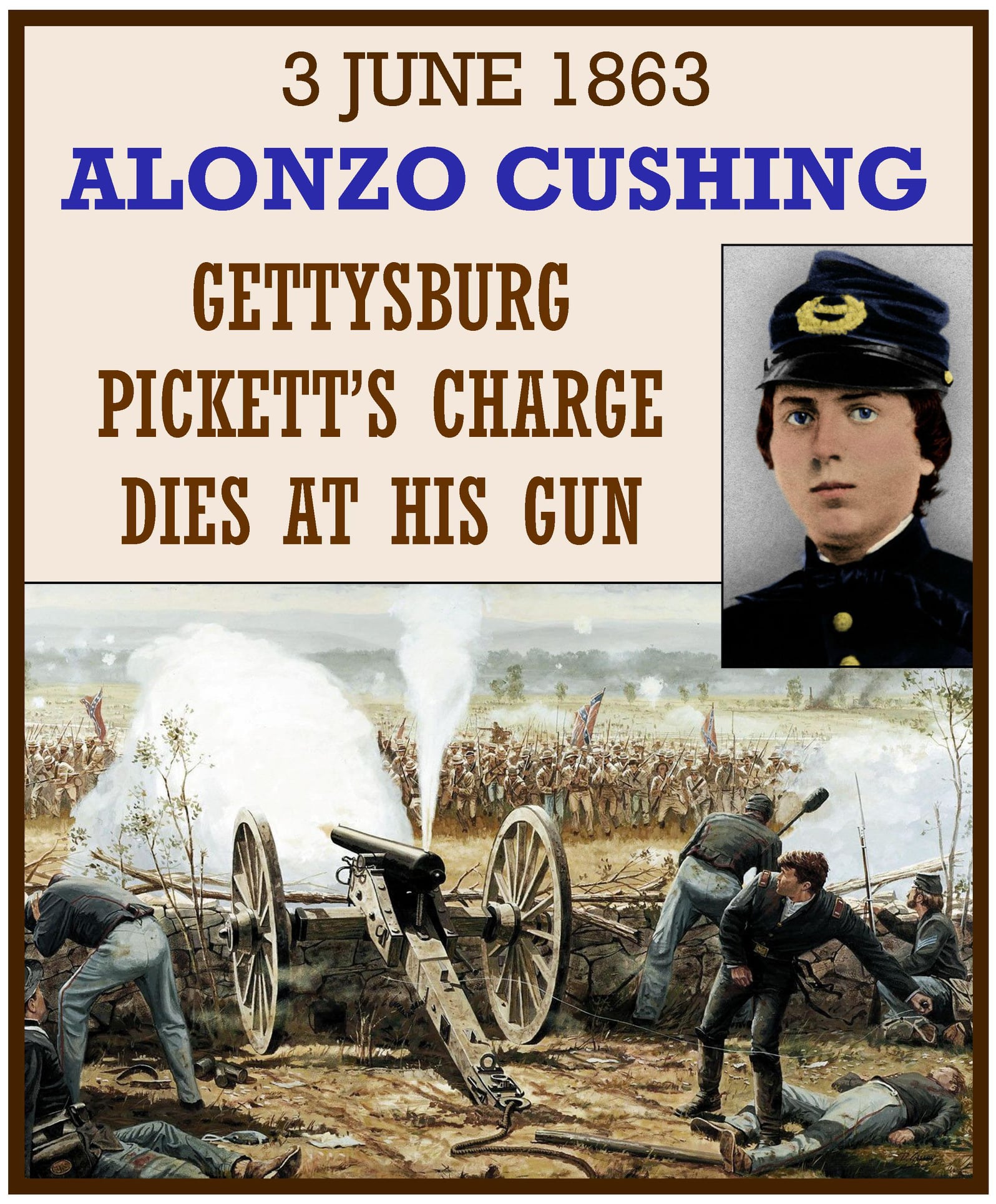 On the third day of the Battle of Gettysburg, July 3, 1863, Cushing commanded Battery A 4th U.S. Artillery, 126 men and six cannons positioned on Cemetery Ridge. In the face of Lt. Gen. James Longstreet’s Assault, Cushing’s battery took a severe pounding by Confederate artillery. Cushing and his battery stood at the apex of the assault where Confederate Maj. Gen. George Pickett intended to pierce the Union line.