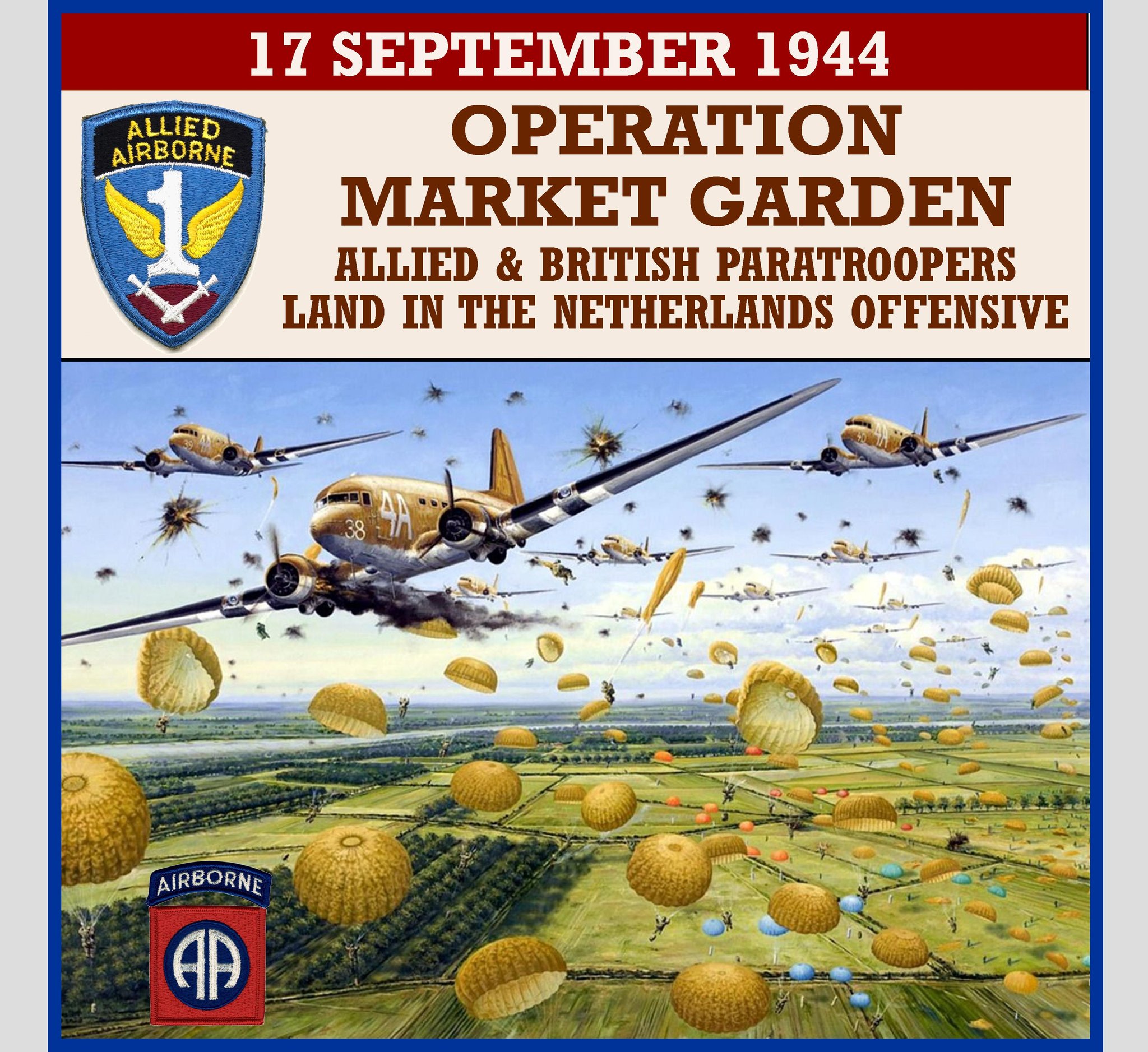Operation Market Garden was an Allied military operation during the Second World War fought in the Netherlands from 17 to 25 September 1944. Its objective was to create a 64 mi salient into German territory with a bridgehead over the River Rhine, creating an Allied invasion route into northern Germany. This was to be achieved by two sub-operations: Seizing nine bridges with combined U.S. and British airborne forces (Market) followed by land forces swiftly following over the bridges (Garden).