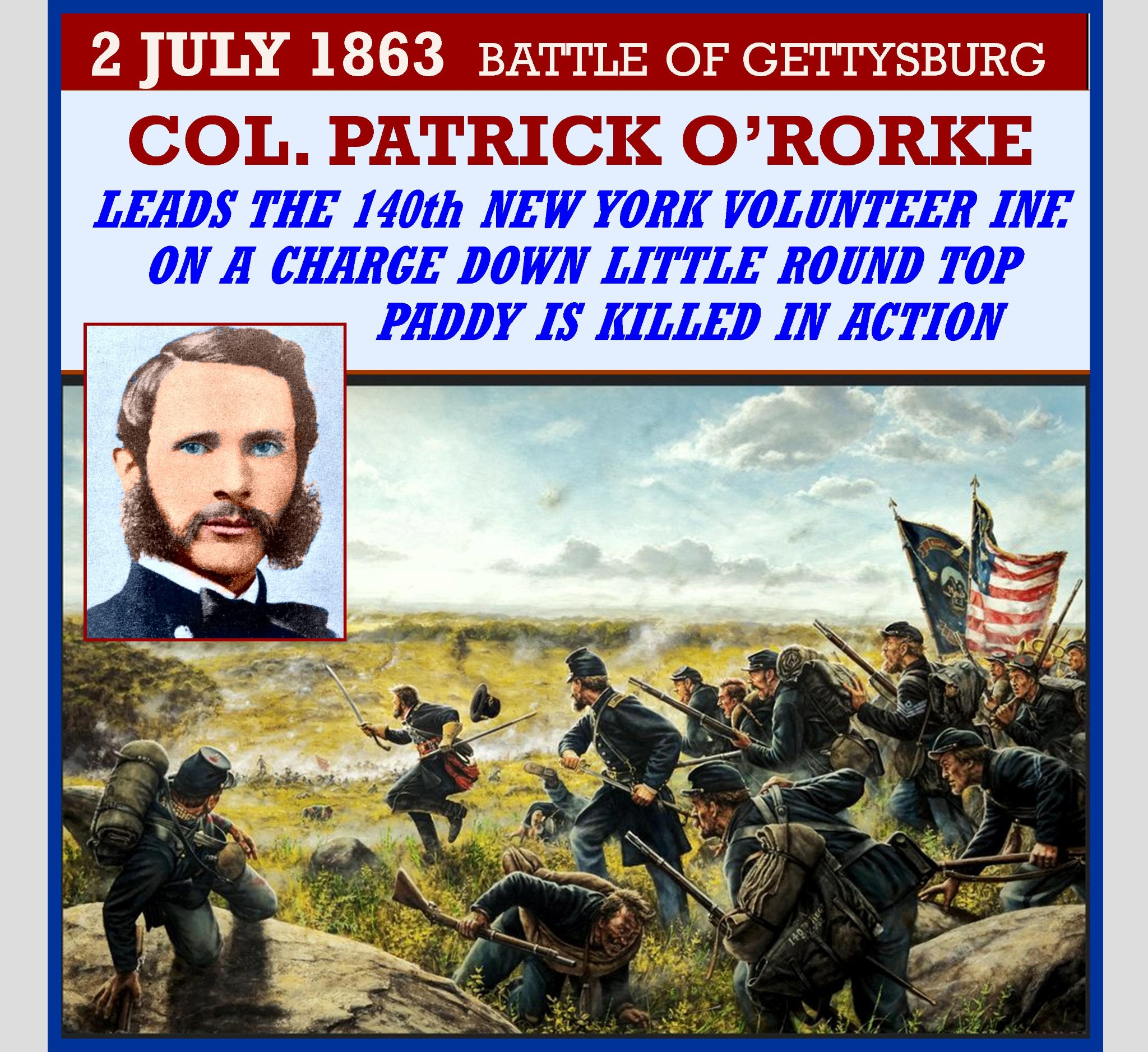 Patrick Henry “Paddy” O’Rorke (March 25, 1837 â July 2, 1863) was an Irish-American immigrant who became a colonel in the Union Army during the American Civil War and was killed at the Battle of Gettysburg.