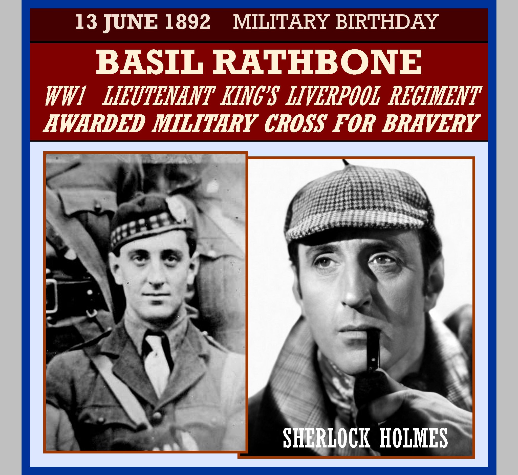 During the First World War, Rathbone was called up in 1915 via the Derby Scheme into the British Army as a private with the London Scottish Regiment, joining a regiment that also included his future professional acting contemporaries Claude Rains, Herbert Marshall and Ronald Colman at different points through the conflict. After basic training with the London Scots in early 1916 he received a commission as a lieutenant in the 2/10th Battalion of the King’s Liverpool Regiment (Liverpool Scottish), where he served as an intelligence officer and attained the rank of captain. Rathbone was twice the British Army Fencing Champ, a skill that would serve him well in movies and allow him to even teach actors Errol Flynn and Tyrone Power the finer art of swordsmanship. Rathbone’s younger brother John was killed in action on 4 June 1918. He persuaded his superiors to allow him to scout enemy positions during daylight rather than at night, as was the usual practice to minimize the chance of detection. Rathbone wore a special camouflage suit that resembled a tree with a wreath of freshly plucked foliage on his head with burnt cork applied to his hands and face. As a result of these highly dangerous daylight reconnaissance missions in September 1918, he was awarded the Military Cross for “conspicuous daring and resource on patrol”.