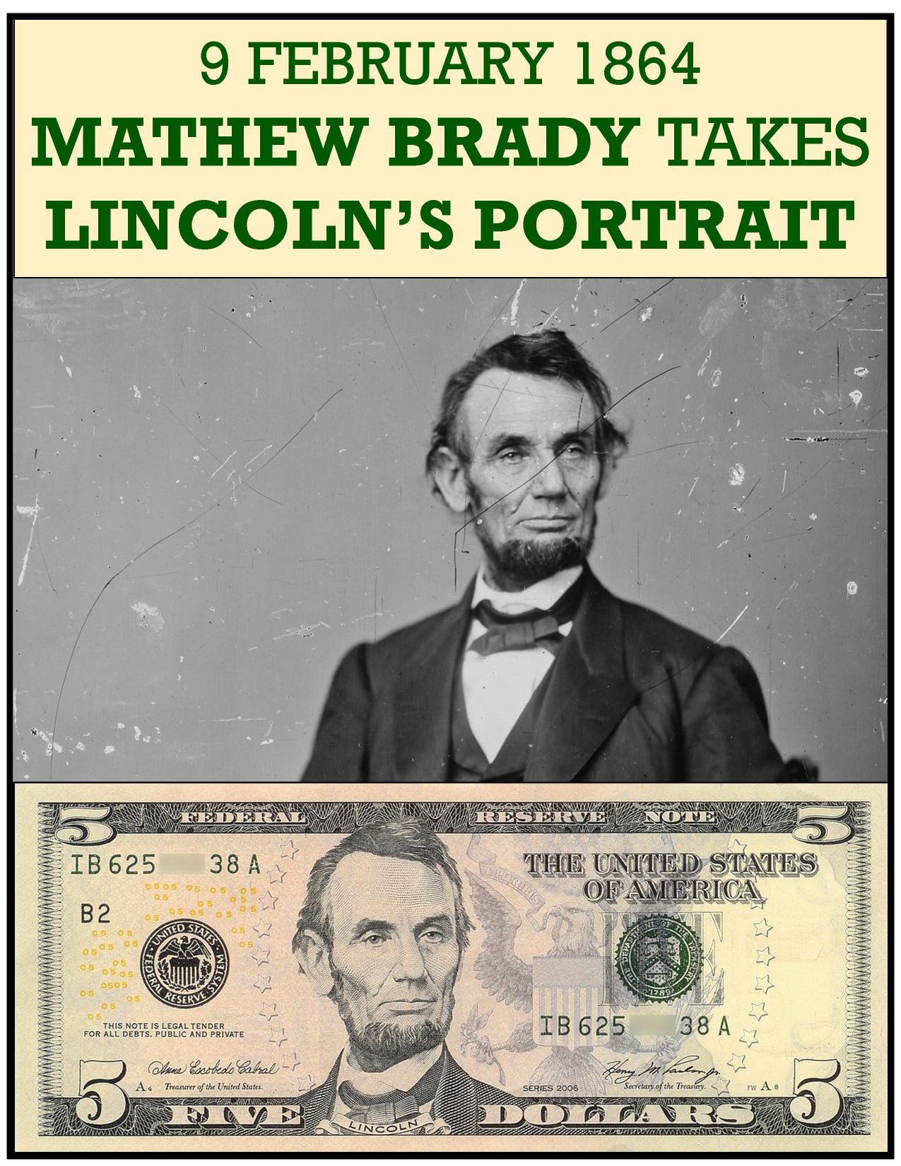 In the afternoon of February 9, 1864, President Lincoln, escorted by artist Francis B. Carpenter, walked more than a mile to Mathew Bradyâs Washington studio, where he sat for several photographs, one of which was later used on the Lincoln-head penny. Another view taken by Bradyâs cameraman, Anthony Berger, became the model for the five dollar bill.