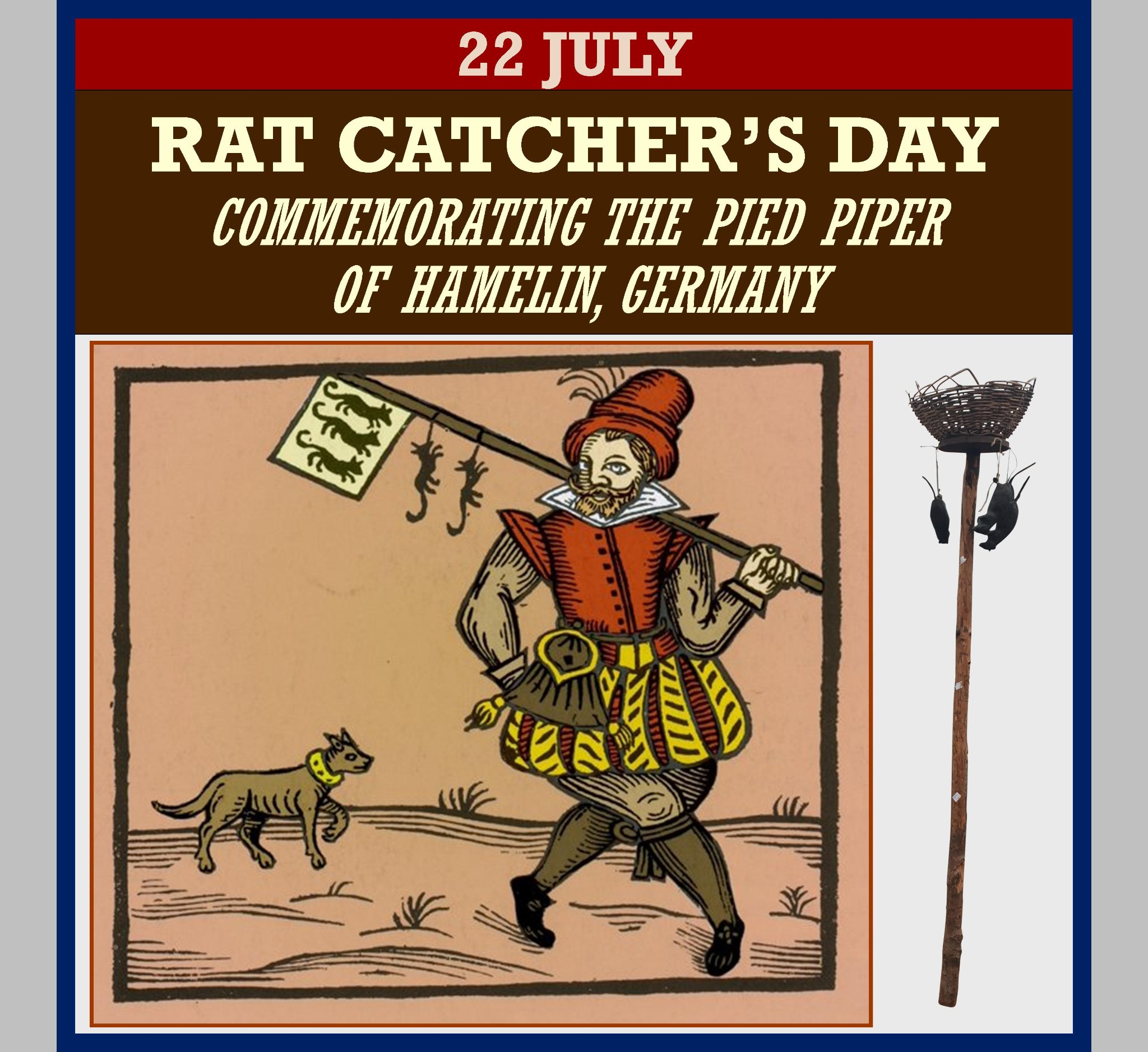Ratcatcher’s Day, Rat-catcher’s Day or Rat Catcher’s Day is celebrated on 22 July, commemorating the myth of the Pied Piper of Hamelin. The town of Hamelin in Germany uses the June date and the term “Pied Piper Day”. The confusion of dates is because the Brothers Grimm cite 26 June 1284 as the date the Pied Piper led the children out of the town, while the poem by Robert Browning gives it as 22 July 1376. It is a holiday remembering rat-catchers, similar to Secretary’s Day and Presidents Day.