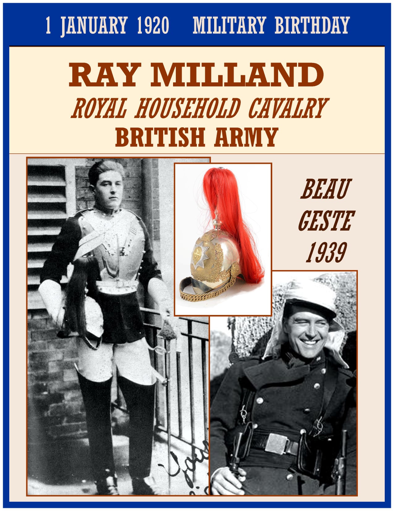 At age 18, Milland joined the Household Cavalry of the British Army, becoming a proficient marksman, horseman, and airplane pilot. He won trophies, including the Bisley Match, with his unit’s crack rifle team. However, after four years, he suddenly lost his means of financial support (independent income being a requirement as a Guardsman) when his stepfather discontinued his allowance. He left the army to pursue a career in acting and appeared as an extra in several British productions before getting his first major role in The Flying Scotsman (1929).