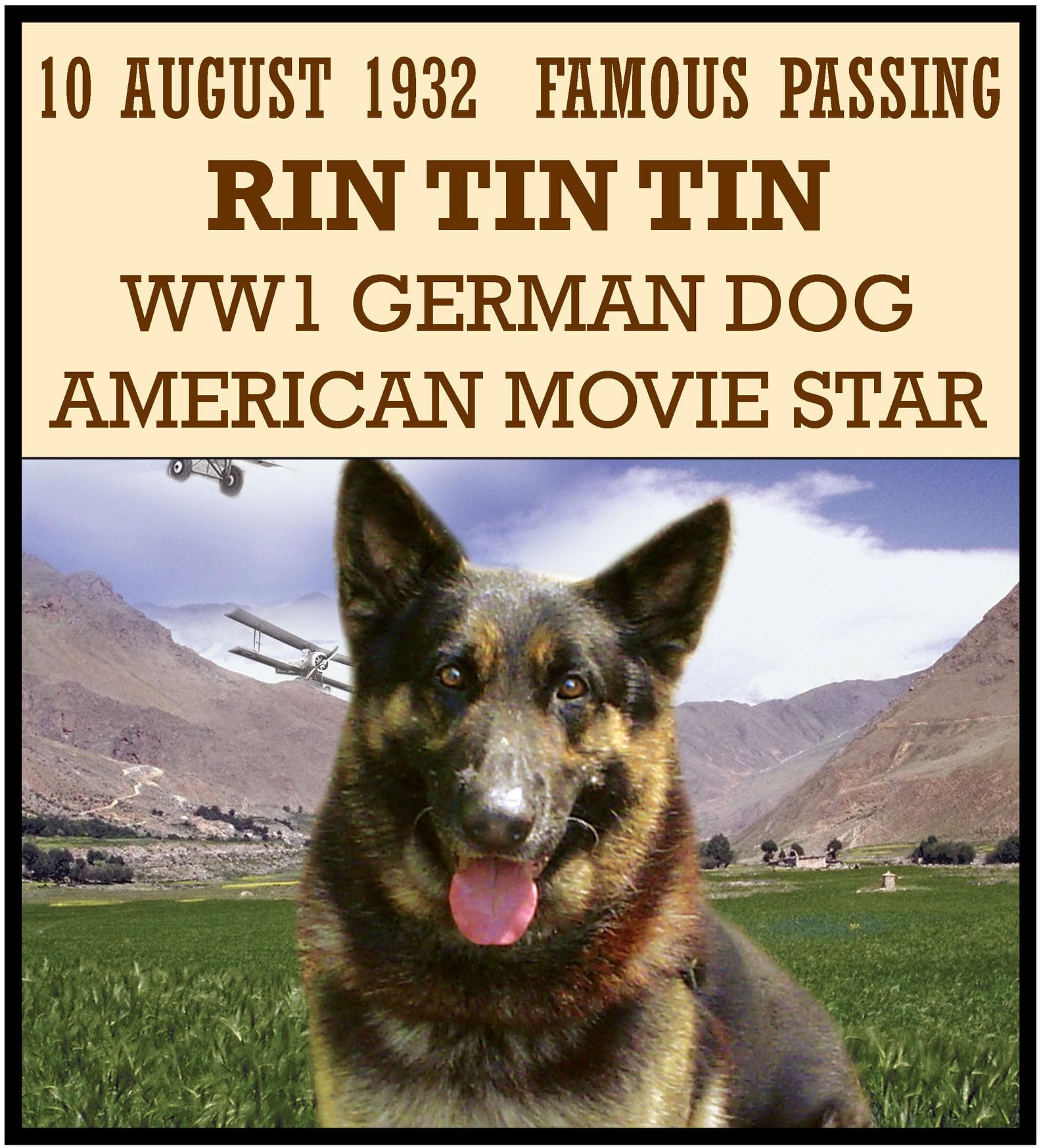 Rin Tin Tin – Died August 10, 1932 b. 1918 German-born American dog actor. American soldier Lee Duncan found Rin Tin Tin in a German trench during World War I and brought him back to Hollywood where he became one of its biggest stars, winning Most Popular Film Performer of the Year award (1926). Rin Tin Tin starred in 27 Hollywood films. After his death, other dogs took over the roll.