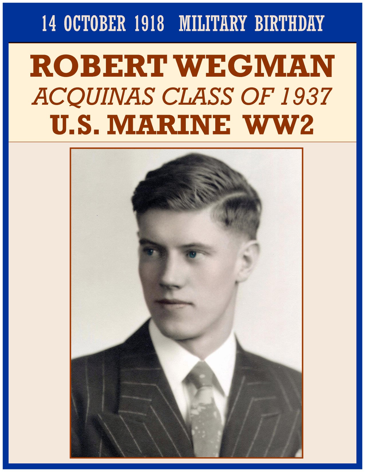 A graduate of Acquinas Institute in Rochester, NY and Niagara University, he served 3 years as a Unites States Marine during WW2.