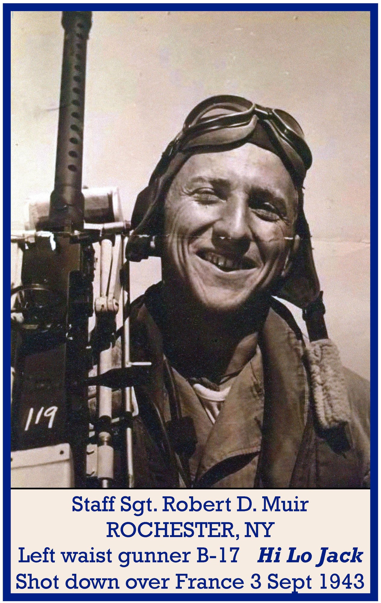 Robert Muir was Left Waist Gunner on B-17 #42-29725 “Hi-Lo Jack”, shot down over France on the 3 September 1943 mission to Romilly-Sur-Seine (Paris). Robert managed to evade capture with the help of many French citizens and members of the Résistance, including Belgians of the “Comète” evasion network. Hidden in various places in France, he was guided to the South and crossed the Pyrénées mountains into Spain on 24 October. He ended up in Gibraltar on 10 November and was flown from there on the 19th, arriving back in England on 20 November 1943.