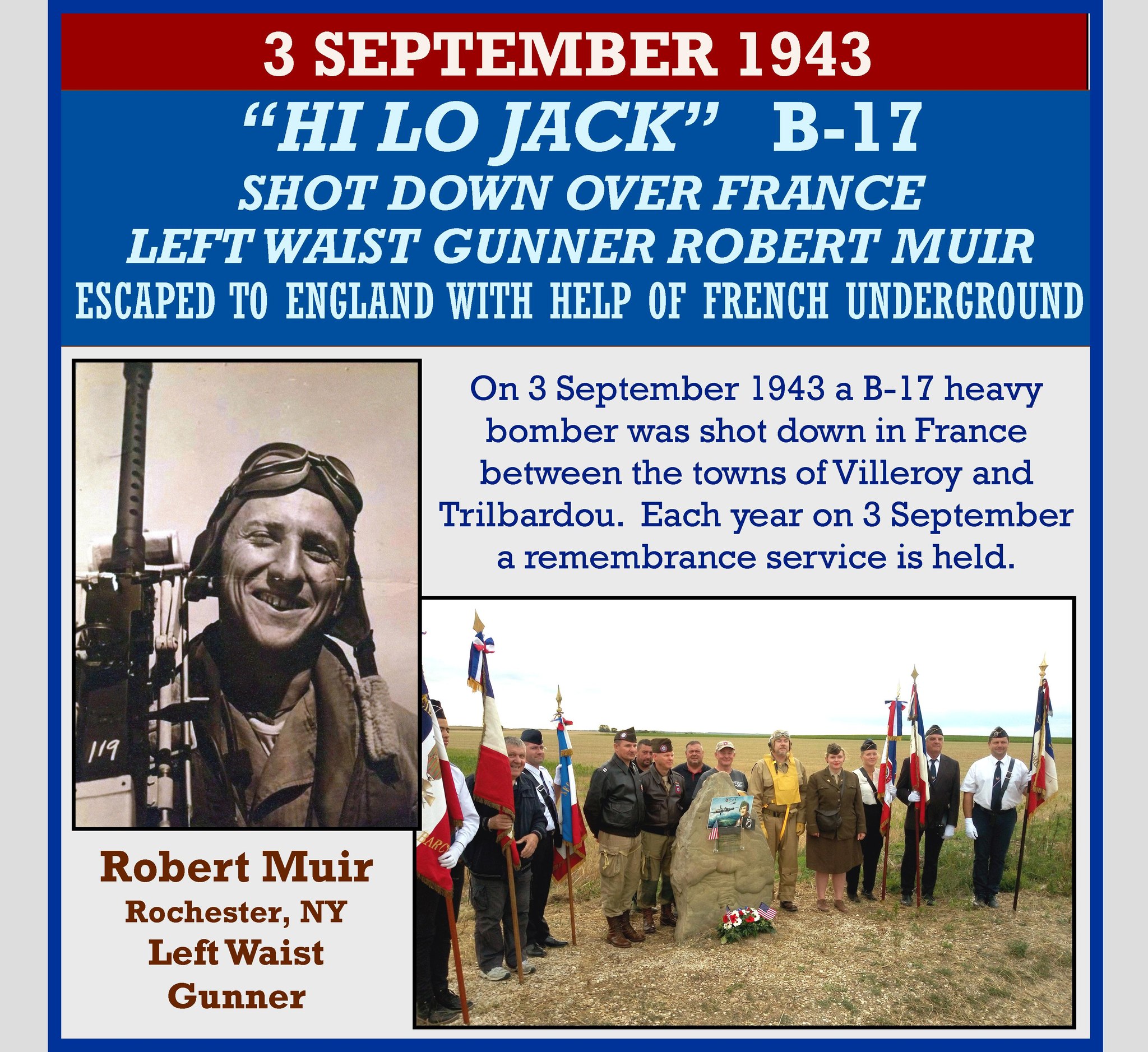 Robert Muir was Left Waist Gunner on B-17 #42-29725 “Hi-Lo Jack”, shot down over France on the 3 September 1943 mission to Romilly-Sur-Seine (Paris). Robert managed to evade capture with the help of many French citizens and members of the Résistance, including Belgians of the “Comète” evasion network. Hidden in various places in France, he was guided to the South and crossed the Pyrénées mountains into Spain on 24 October. He ended up in Gibraltar on 10 November and was flown from there on the 19th, arriving back in England on 20 November 1943.