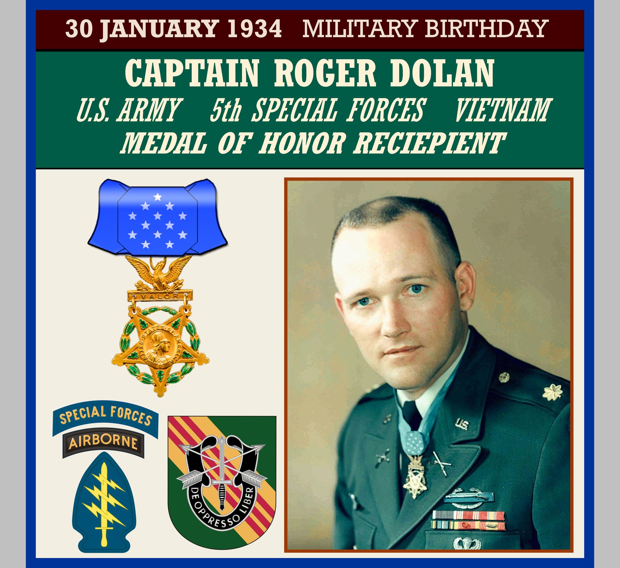 Capt. Donlon was serving as the commanding officer of the U.S. Army Special Forces Detachment A-726 at Camp Nam Dong when a reinforced Viet Cong battalion suddenly launched a full-scale, predawn attack on the camp. During the violent battle that ensued, lasting 5 hours and resulting in heavy casualties on both sides, Capt. Donlon directed the defense operations in the midst of an enemy barrage of mortar shells, falling grenades, and extremely heavy gunfire. Upon the initial onslaught, he swiftly marshaled his forces and ordered the removal of the needed ammunition from a blazing building. He then dashed through a hail of small arms and exploding hand grenades to abort a breach of the main gate. En route to this position he detected an enemy demolition team of 3 in the proximity of the main gate and quickly annihilated them. Although exposed to the intense grenade attack, he then succeeded in reaching a 60mm mortar position despite sustaining a severe stomach wound as he was within 5 yards of the gun pit. When he discovered that most of the men in this gunpit were also wounded, he completely disregarded his own injury, directed their withdrawal to a location 30 meters away, and again risked his life by remaining behind and covering the movement with the utmost effectiveness. Noticing that his team sergeant was unable to evacuate the gun pit he crawled toward him and, while dragging the fallen soldier out of the gunpit, an enemy mortar exploded and inflicted a wound in Capt. Donlon’s left shoulder. Although suffering from multiple wounds, he carried the abandoned 60mm mortar weapon to a new location 30 meters away where he found 3 wounded defenders. After administering first aid and encouragement to these men, he left the weapon with them, headed toward another position, and retrieved a 57mm recoilless rifle. Then with great courage and coolness under fire, he returned to the abandoned gun pit, evacuated ammunition for the 2 weapons, and while crawling and dragging the urgently needed ammunition, received a third wound on his leg by an enemy hand grenade. Despite his critical physical condition, he again crawled 175 meters to an 81mm mortar position and directed firing operations which protected the seriously threatened east sector of the camp. He then moved to an eastern 60mm mortar position and upon determining that the vicious enemy assault had weakened, crawled back to the gun pit with the 60mm mortar, set it up for defensive operations, and turned it over to 2 defenders with minor wounds. Without hesitation, he left this sheltered position, and moved from position to position around the beleaguered perimeter while hurling hand grenades at the enemy and inspiring his men to superhuman effort. As he bravely continued to move around the perimeter, a mortar shell exploded, wounding him in the face and body. As the long awaited daylight brought defeat to the enemy forces and their retreat back to the jungle leaving behind 54 of their dead, many weapons, and grenades, Capt. Donlon immediately reorganized his defenses and administered first aid to the wounded. His dynamic leadership, fortitude, and valiant efforts inspired not only the American personnel but the friendly Vietnamese defenders as well and resulted in the successful defense of the camp.