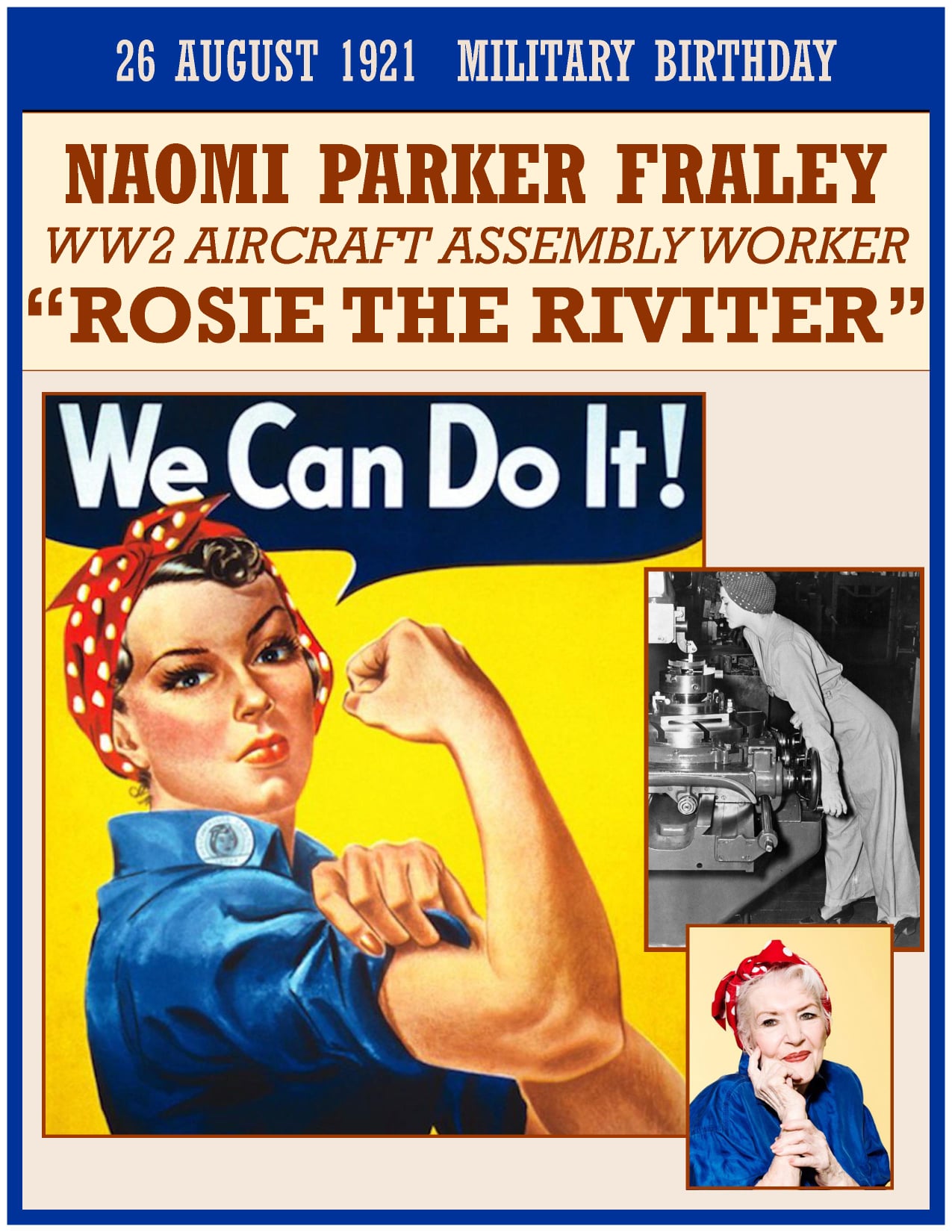 Naomi Fern Parker Fraley (August 26, 1921 â January 20, 2018) was an American war worker who is now considered the most likely model for the iconic “We Can Do It!” poster. During World War II, she worked on aircraft assembly at the Naval Air Station Alameda. She was photographed operating a machine tool and this widely used photograph was thought to be an inspiration for the poster. Geraldine Hoff Doyle was initially credited as the subject but research by a professor at Seton Hall University set the record straight.