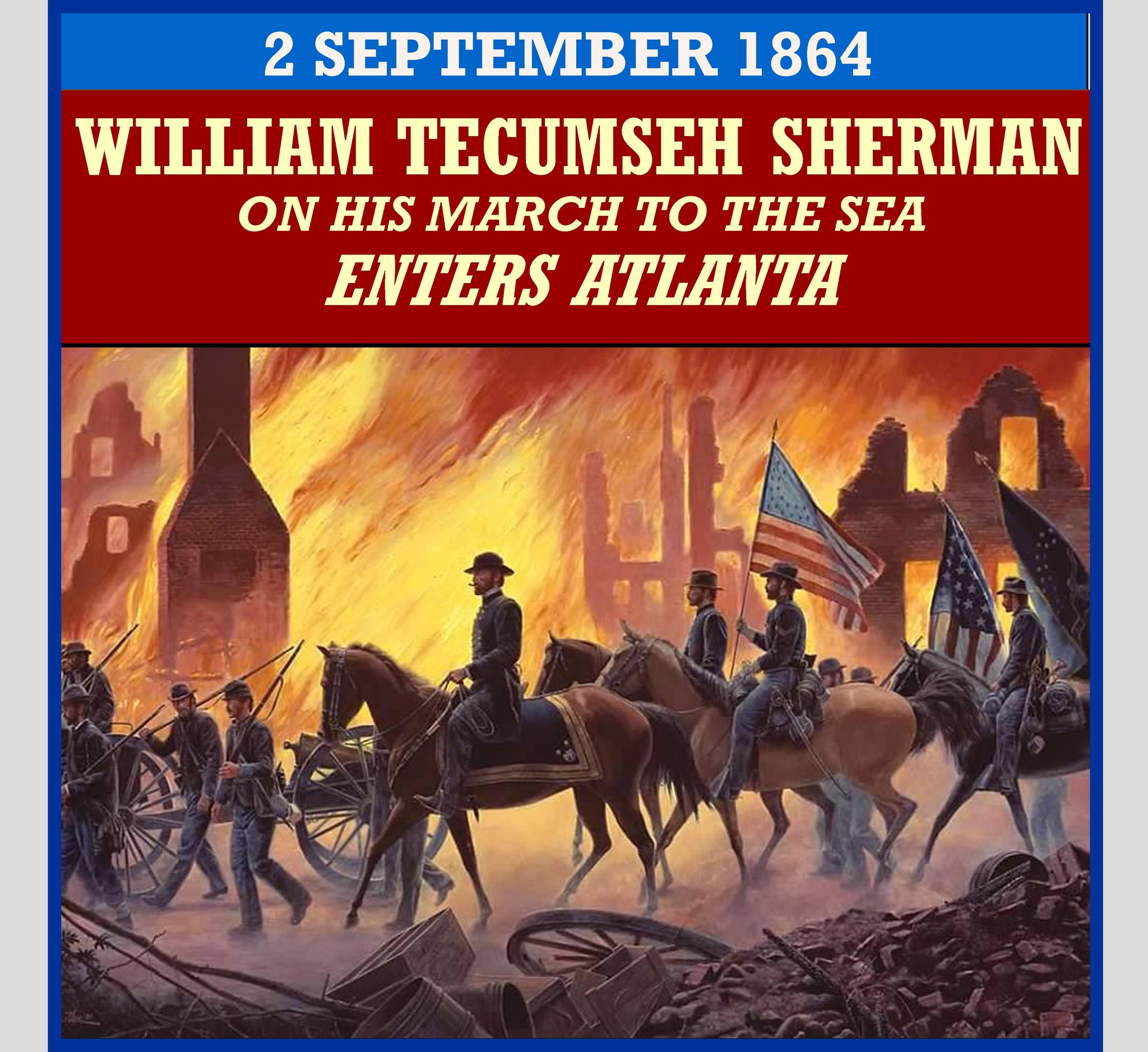 Sept 2, 1864. After a four-week siege, Union General William Tecumseh Sherman entered Atlanta, GA. The city had been evacuated on the previous day by Confederate troops under General John B. Hood. Hood had mistakenly assumed Sherman was ending the siege which began on Aug 27, when actually Sherman was beginning the final stages of his attack. Hood then sent troops to attack the Union forces at Jonesboro. Hoods troops were defeated, opening the way for the capture of Atlanta.