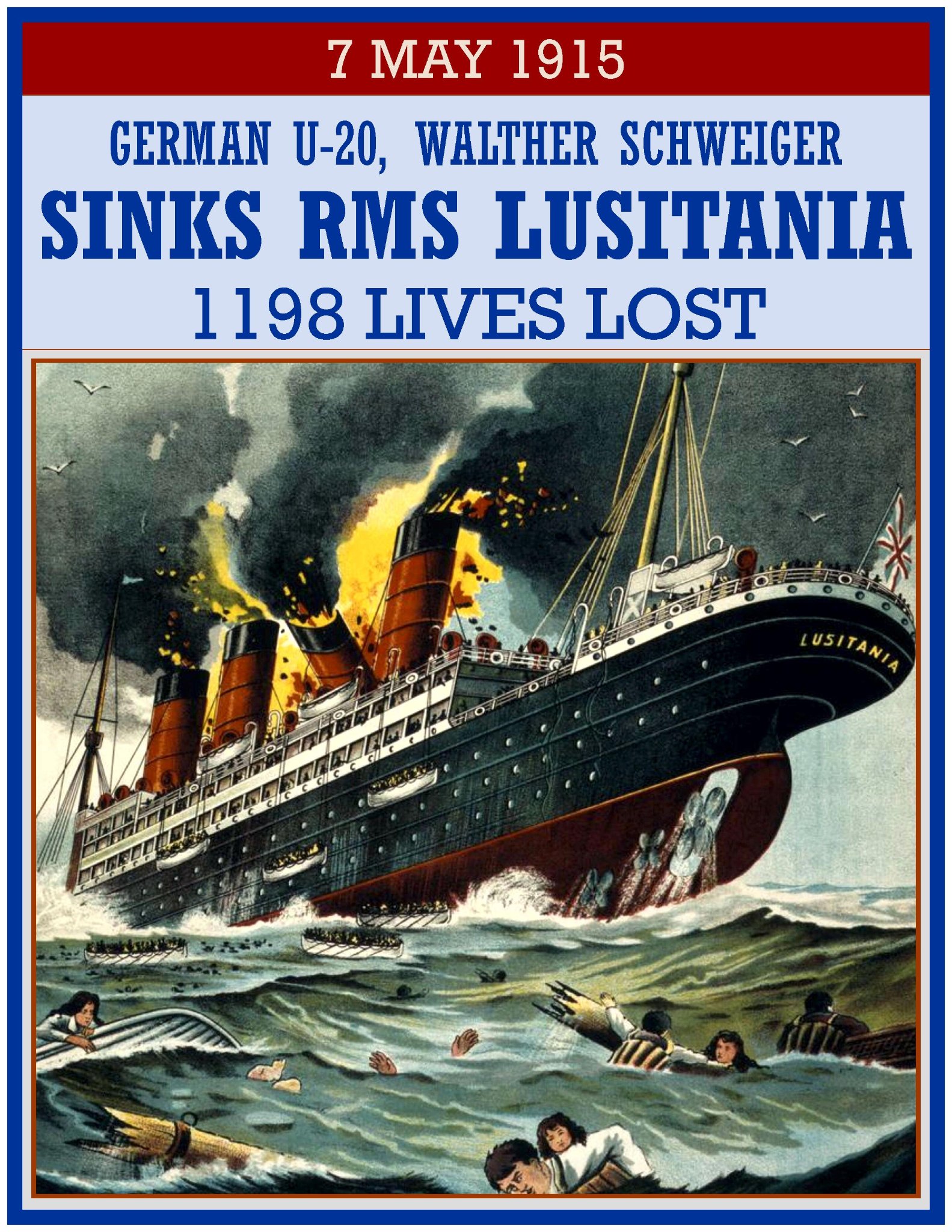 Sinking of the Lusitania May 7, 1915 This civilian steamer RMS Lusitania is sunk by the German U-20 submarine’s torpedo, killing 1,198 (including 128 Americans) of 1,959 people on board. It was later revealed that the Lusitania was carrying about 173 tons of war munitions for Britain, which the Germans cited as justification for the attack. The sinking contributed to the U.S. entry into World War I and became an iconic symbol in military recruiting campaigns.