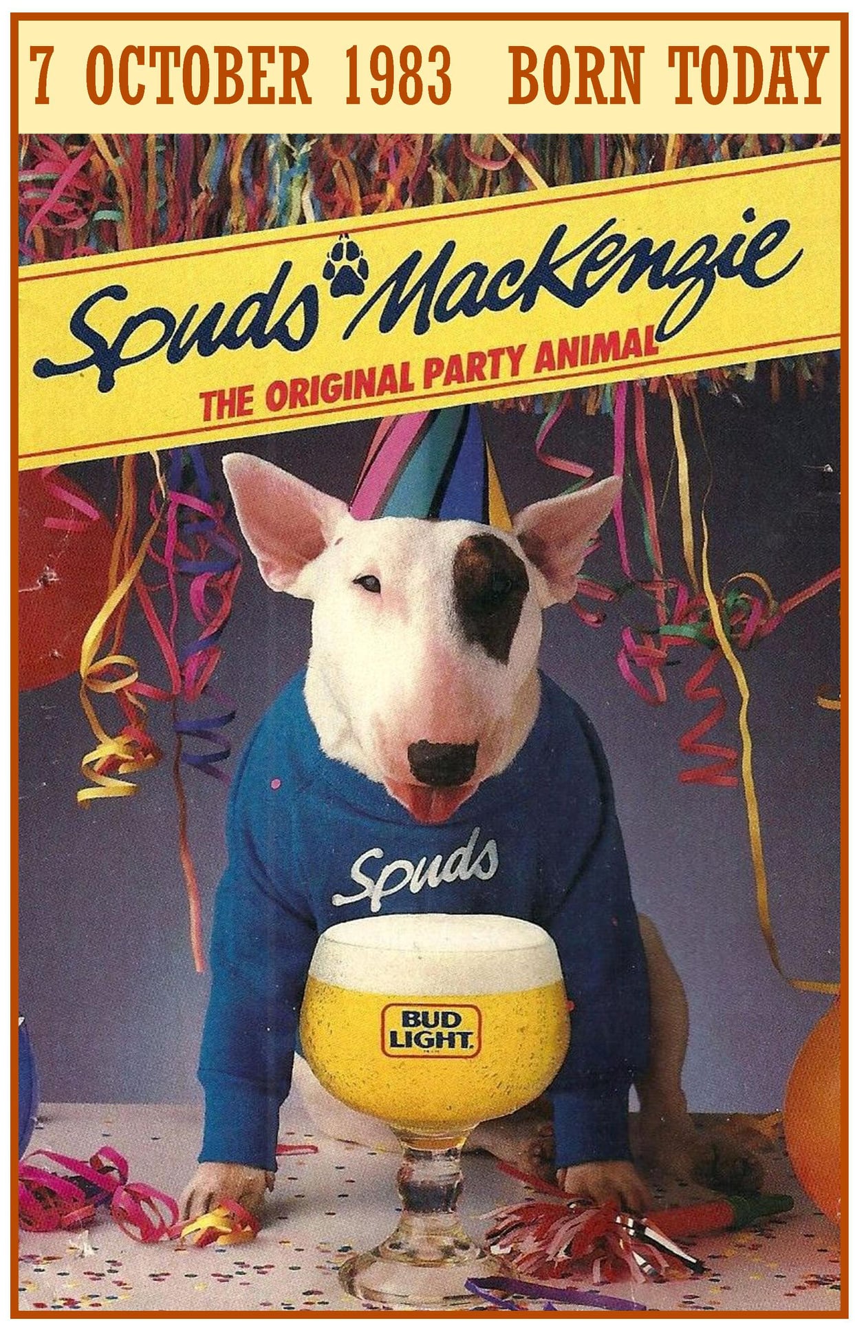 Spuds MacKenzie (Honey Tree Evil Eye) Born October 7, 1983 d. 1993 American spokes dog. Made her first TV appearance for Bud Light during 1987 Super Bowl. Her appearance generated large sales of Spuds memorabilia. The ads were attacked by temperance-oriented groups and were also attacked by U.S. Senator Strom Thurmond claiming the ads were designed to appeal to children. More legal action resulted from the use of ads featuring Spuds dressed as Santa, which is illegal in states such as Ohio. Budweiser eventually pulled the ads due to all the controversies since Spuds was a female dog portraying a male character.
