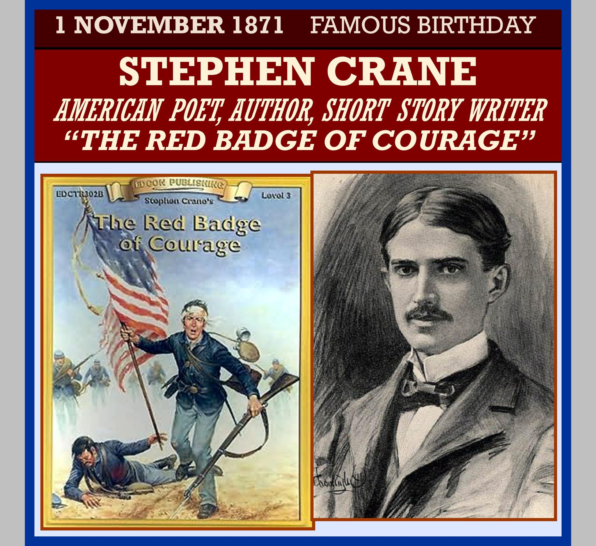 The ninth surviving child of Methodist parents, Crane began writing at the age of four and had several articles published by the age of 16. Having little interest in university studies though he was active in a fraternity, he left Syracuse University in 1891 to work as a reporter and writer. Crane’s first novel was the 1893 Bowery tale Maggie: A Girl of the Streets, generally considered by critics to be the first work of American literary Naturalism. He won international acclaim in 1895 for his Civil War novel The Red Badge of Courage, which he wrote without having any battle experience.