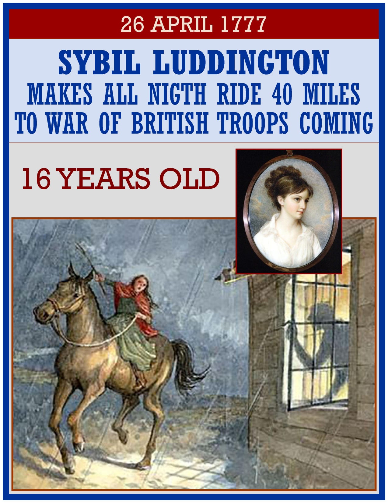 Sybil Ludington (April 5, 1761 â February 26, 1839) was a heroine of the American Revolutionary War. On April 26, 1777, at age 16, she made an all-night horseback ride to alert militia forces in the towns of Putnam County, New York, and Danbury, Connecticut, of the approach of British forces. Her story was first published in 1880 by local historian Martha Lamb, to whom it was probably told by Ludington’s descendants. Her book has the earliest known reference to Ludington’s ride. Ludington was the daughter of a Westchester County militia colonel who needed to rally the hundreds of local troops under his command and needed time to plan the battle yet to come, so either she volunteered to warn the surrounding towns and rally the troops, or she carried out the task at her father’s direction.