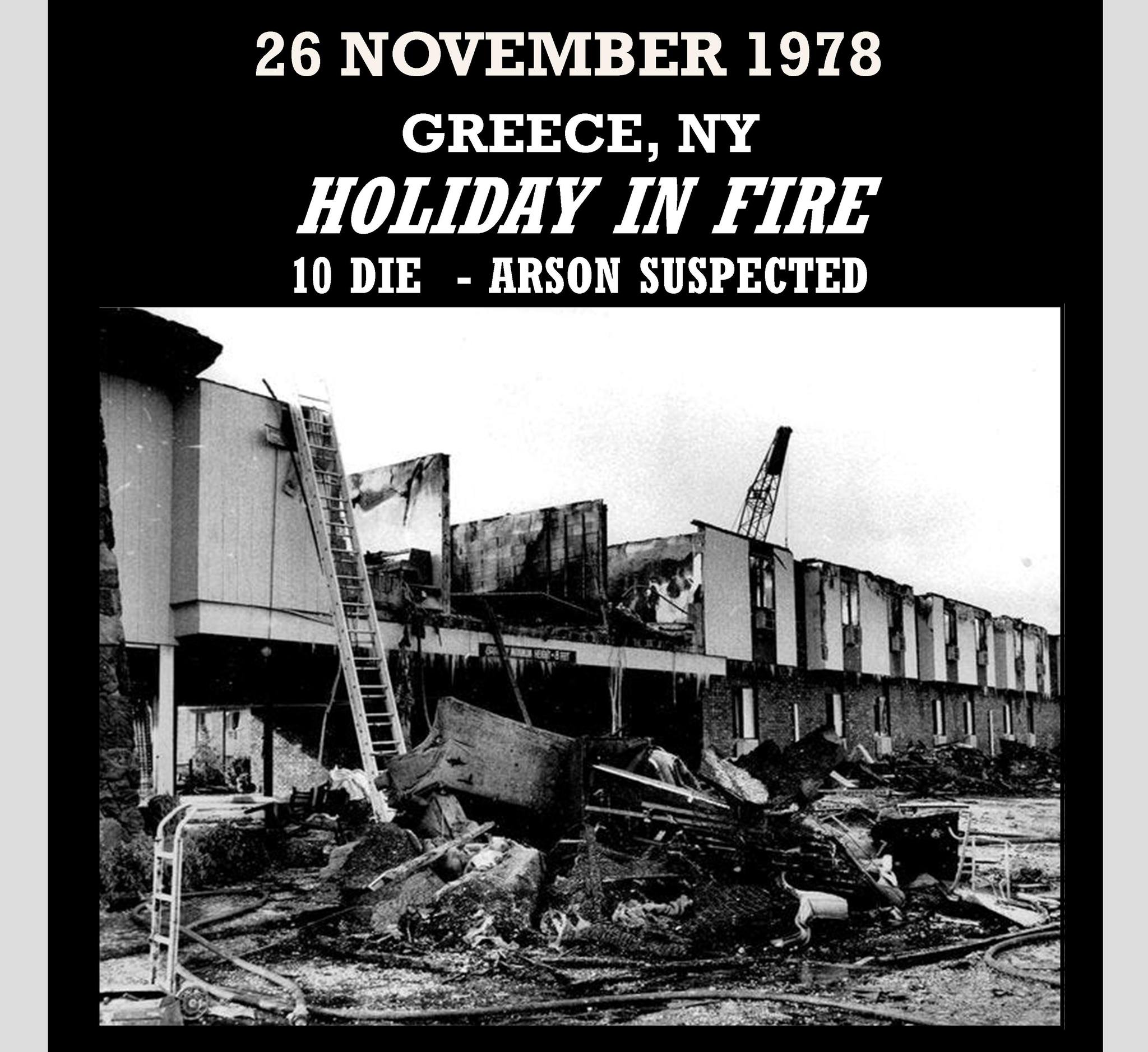 The 1978 Holiday Inn fire broke out at a Holiday Inn hotel located at 1525 West Ridge Road in the town of Greece, New York, United States, on November 26, 1978. The fire was considered notable enough by the National Fire Protection Association (NFPA) and the Center for Fire Research to document the fire in their 1979 publications. In the end, ten people were killed and 34 injured; seven of the fatalities were Canadian nationals. In 2008, the NFPA listed the 1978 Holiday Inn fire as one of only three dozen or so fires which killed ten or more people in the U.S. between 1934 and 2006.