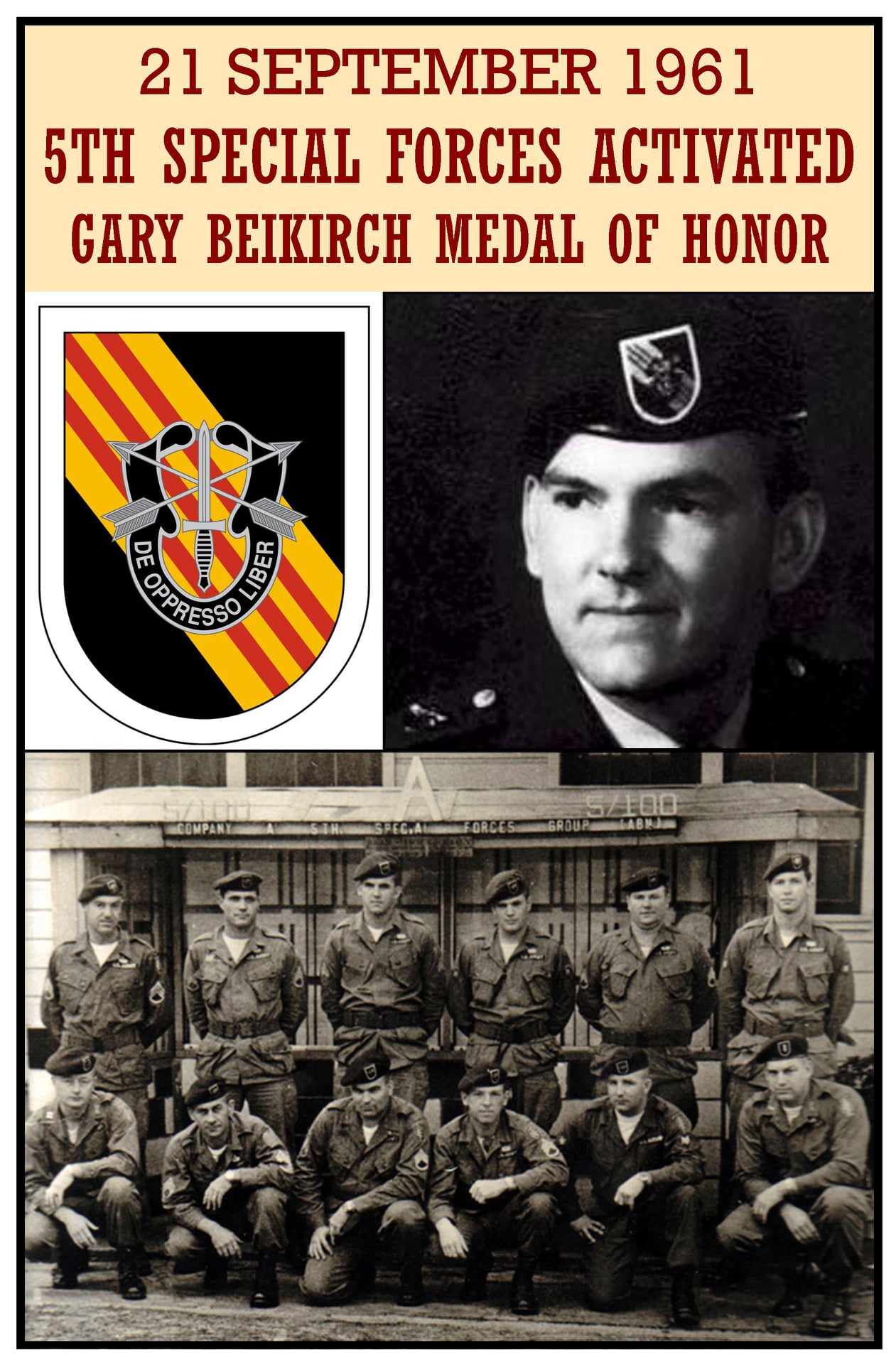 The 5th Special Forces Group (Airborne) (5th SFG) is one of the most decorated active duty United States Army Special Forces groups in the U.S. armed forces. The 5th SFG saw extensive action in the Vietnam War and played a pivotal role in the early months of Operation Enduring Freedom. Gary Beikirch, a Rochester native, was awarded the Medal of Honor for action on 1 April 1970 while serving with the 5th in Vietnam.