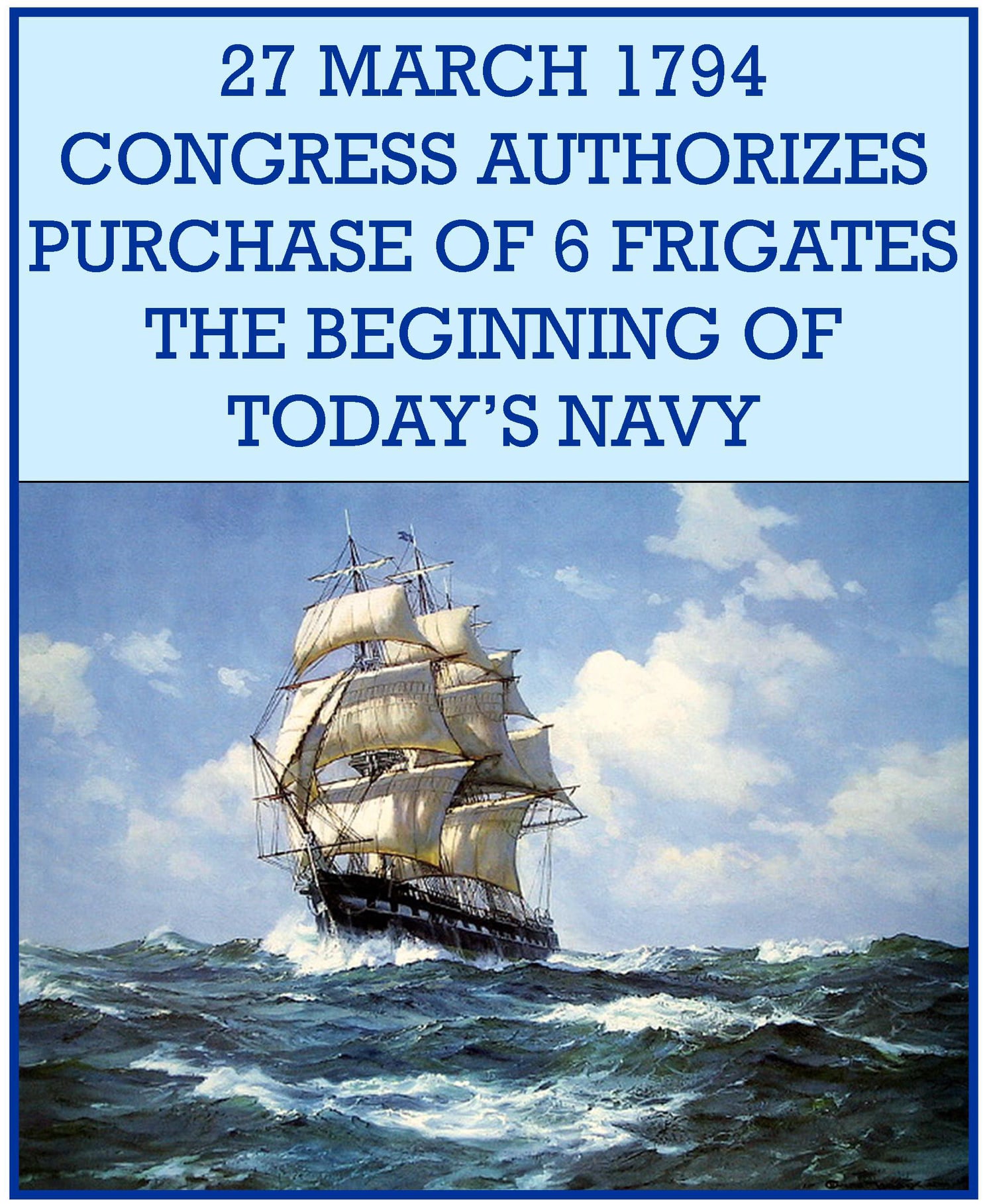 The Act to Provide a Naval Armament, also known as the Naval Act of 1794, or simply, the Naval Act, was passed by the 3rd United States Congress on March 27, 1794, and signed into law by President George Washington. The act authorized the construction of six frigates at a total cost of $688,888.82. These ships were the first ships of what eventually became the present-day United States Navy. Tthe first ships of the United States Navy, the USS Constitution, the USS Chesapeake , the USS Constellation , the USS President, the USS United States, and the USS Congress. The ships were designed to be heavy frigates â longer and faster than the conventional frigates of their day, able to stand and fight against any ships their size and fast enough to evade larger ships of the line.