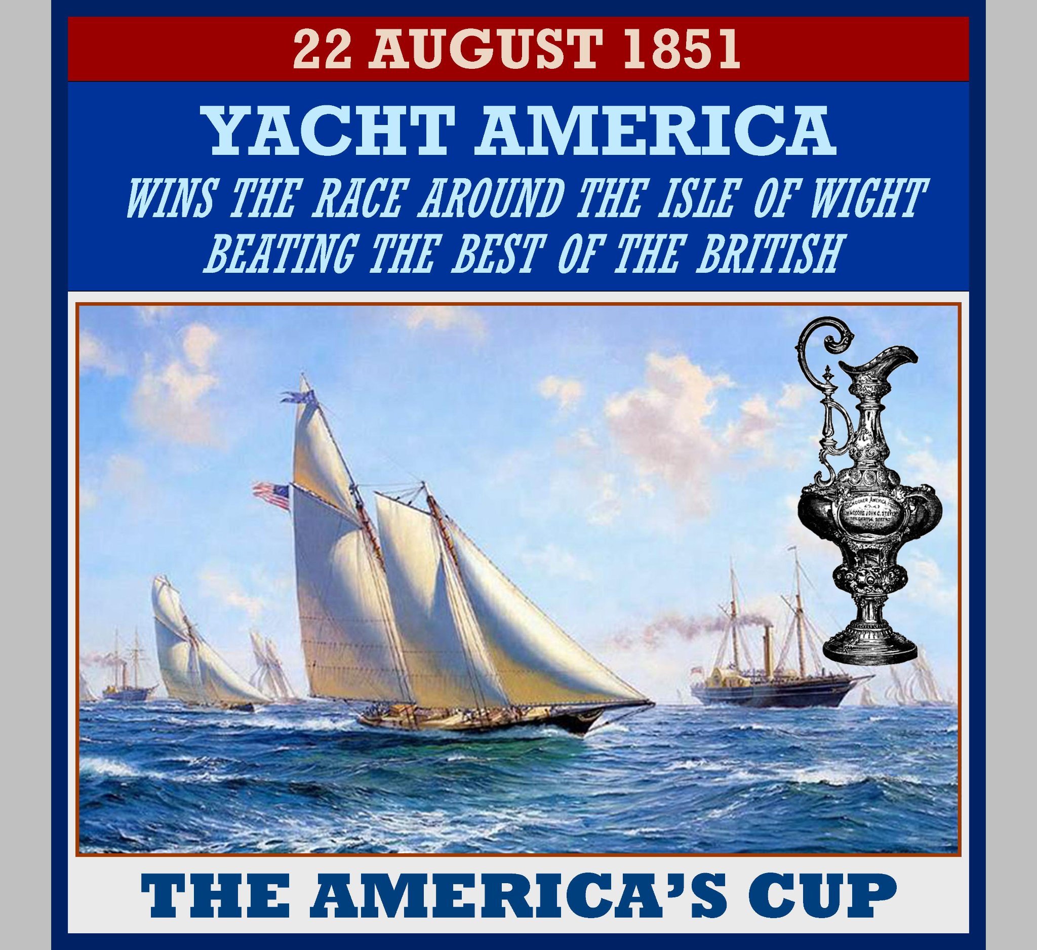 The cup was originally known as the ‘R.Y.S. £100 Cup’, awarded in 1851 by the British Royal Yacht Squadron for a race around the Isle of Wight in the United Kingdom. The winning yacht was a schooner called America, owned by a syndicate of members from the New York Yacht Club (NYYC). In 1857, the syndicate permanently donated the trophy to the NYYC, under a Deed of Gift that renamed the trophy as the ‘America’s Cup’ after the first winner and required it be made available for perpetual international competition.