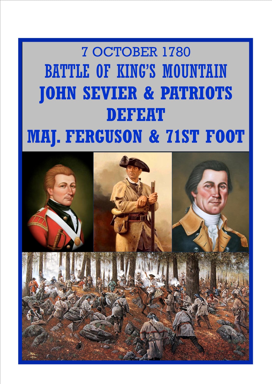 The Battle of Kings Mountain was a military engagement between Patriot and Loyalist militias in South Carolina during the Southern Campaign of the American Revolutionary War, resulting in a decisive victory for the Patriots. The battle took place on October 7, 1780, 9 miles (14 km) south of the present-day town of Kings Mountain, North Carolina. In what is now rural Cherokee County, South Carolina, the Patriot militia defeated the Loyalist militia commanded by British Major Patrick Ferguson of the 71st Foot. The battle has been described as “the war’s largest all-American fight”.